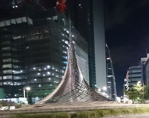 JR名古屋駅桜通口前のロータリーにそびえる、銀色の円錐形のモニュメントです。名古屋市制100周年に当る平成元年に設置されたようです。昼は日の光で輝き、夜はライトアップされ輝いています。今後のリニア中央新幹線開業に向けて、ロータリーの改良が検討されていて、このモニュメント移設されるようです。