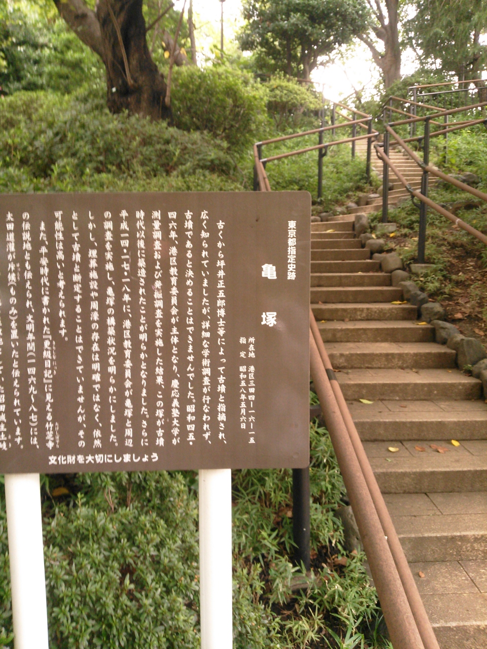 三田の亀塚公園の中にある築山のようなものが、昔から古墳ではないかと言われており、亀塚と呼ばれていました。立派な説明文が階段の手前にあったので、来歴を知ることができます。上までちょっとの階段を上って見晴らしを楽しむのも良いと思います。