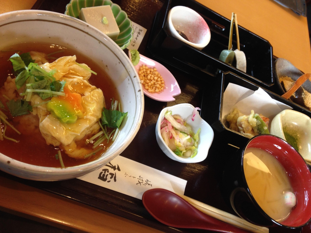 嵐山に3店舗あるようです。ランチで利用しましたが、嵐山はとにかく激混みだったのでタイミング次第で並ぶようになる予感がしたので早目の11時に昼食をとりました。湯葉のあんかけどんぶりがメインのセットをオーダー。京都麩だったりお漬物だったりゴマ豆腐や、デザートのわらびもちや蜂蜜豆乳がどれもおいしくいただきました。