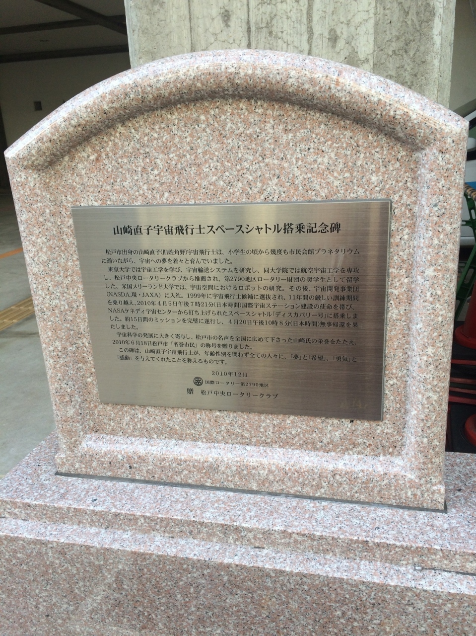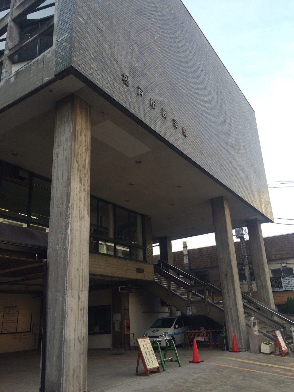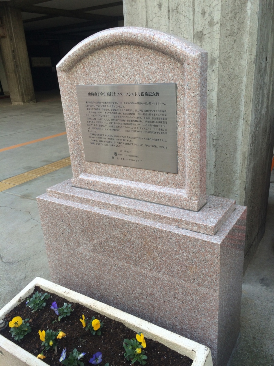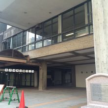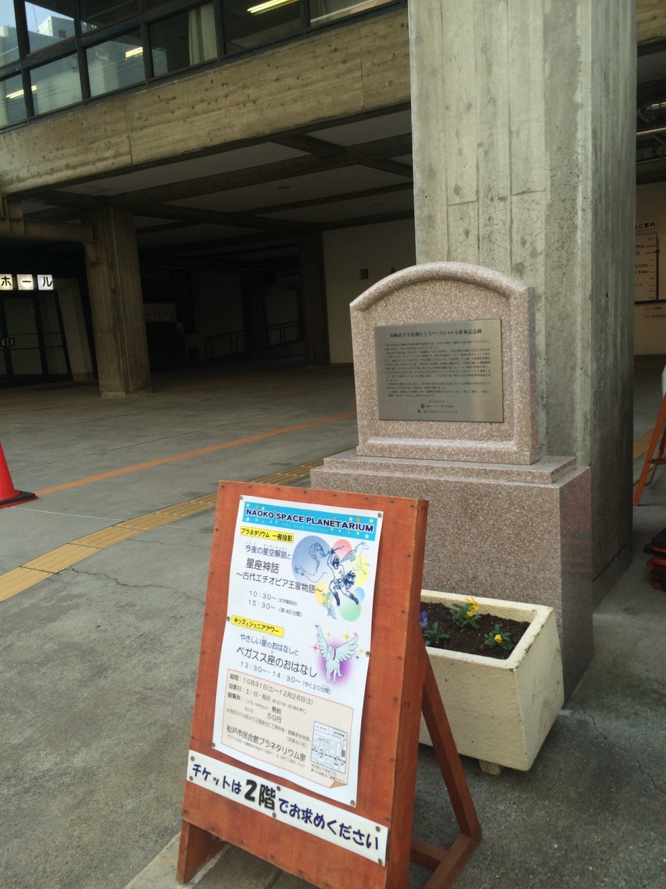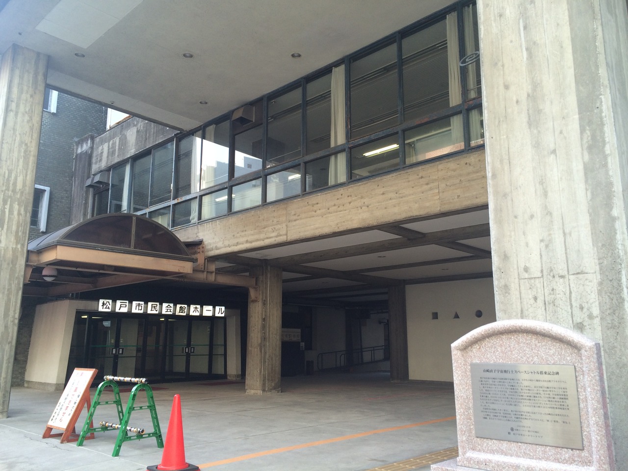 建物が古い松戸市民会館ホールの一角に2010年12月に建てられた碑があります。会館ホールガード古いので石碑は新しく感じられ綺麗な碑でが目立つ碑ではないです。石碑には花壇がありその前には催し物の看板が置いてありました。