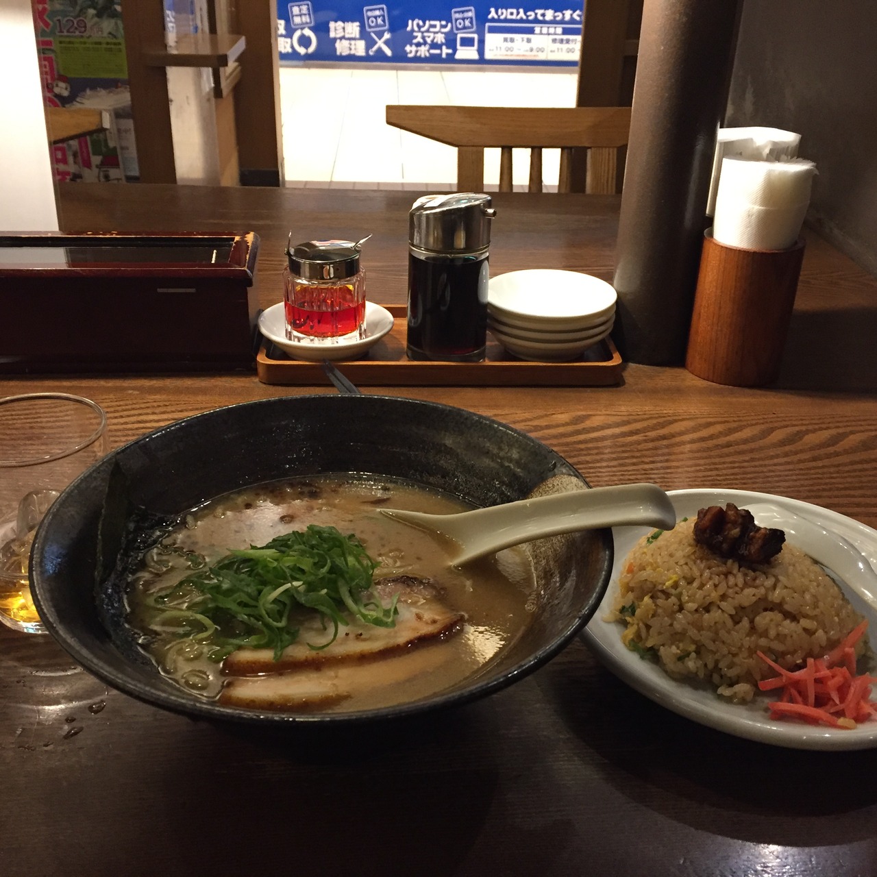 出張帰りにふらっと寄りました。大阪駅桜橋口付近の梅三小路にあるラーメン屋さんです。頂いたのは、トンコツラーメンと半チャーハンのセット880円です。ラーメンは横綱の味に似ていて、なかなか美味しかったですが、半チャーハンなのに大盛無料のチャーハンが甘ったるい味で好みではなかったですが、ボリュームがあり満腹になりました。男性向きと思います。