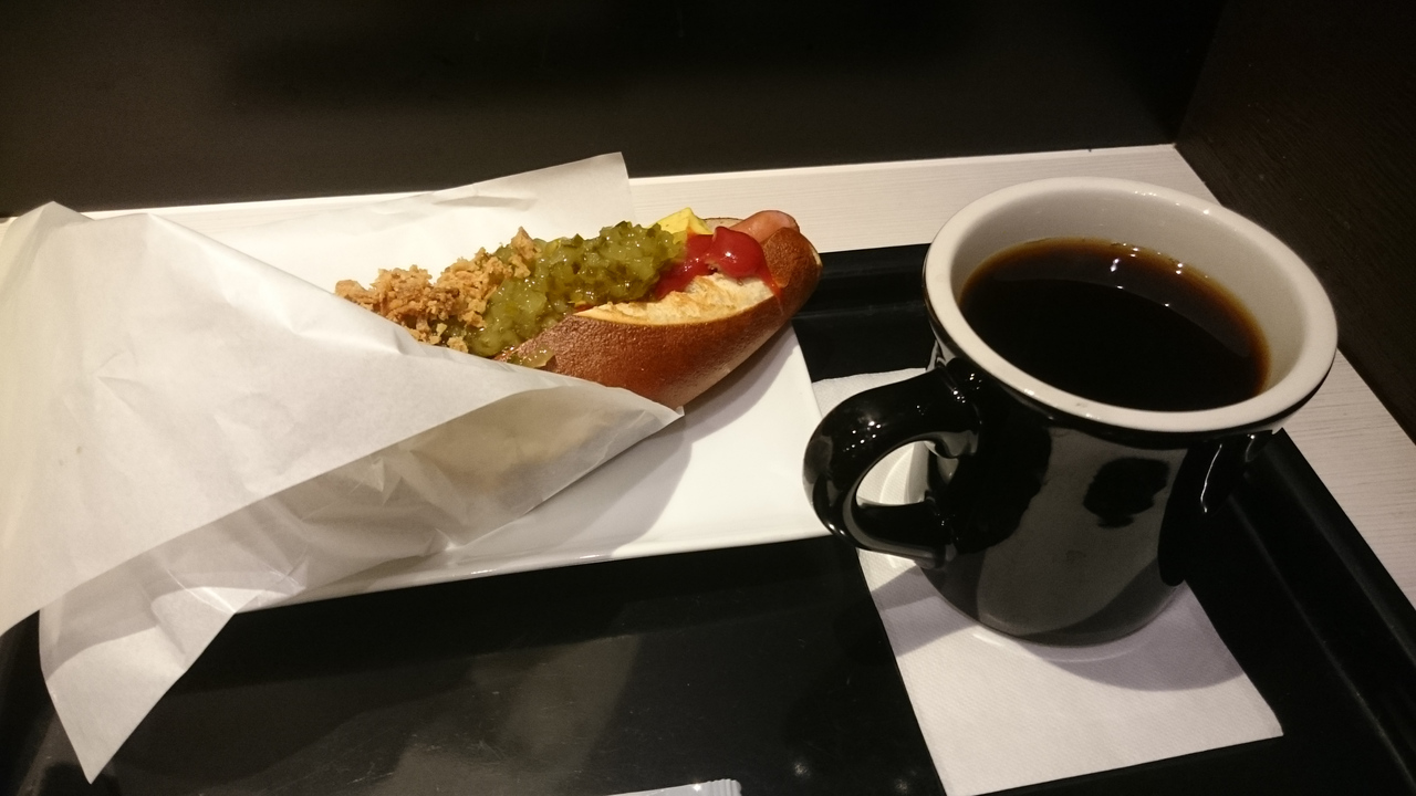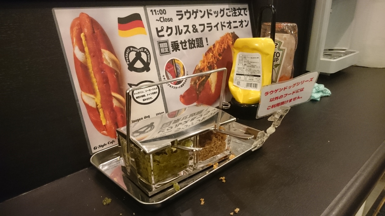 五反田駅西口から徒歩数分。桜田通り沿いのカフェ。お店は黒に統一されたおしゃれな感じです。お店の「G」は五反田のGでチェーン店ではないようです。コーヒーは、ブレンドを頼みましたが、クセがなく普通のコーヒーでしたが、ブラックでも飲みやすかったです。このお店にひかれたのは、「ラウゲンドッグ」という、ドイツのビールのおつまみとして有名なプレッツェルの生地を使ったパンで挟んだホットドック。普通のホットドックに比べて、フランスパンほどではないですが、パンに食感があって、食べ応えがあります。お昼ご飯も少食ならこれ一本でいけそうな感じ。ソーセージもパリッとしていて美味でした。カフェのホットドックとしてはかなりのレベルだと思います。コンセントも結構あり、スマホの充電にも便利なようになっています。ちょうど、ピクルスとフライオニオン入れ放題のキャンペーン中でした。