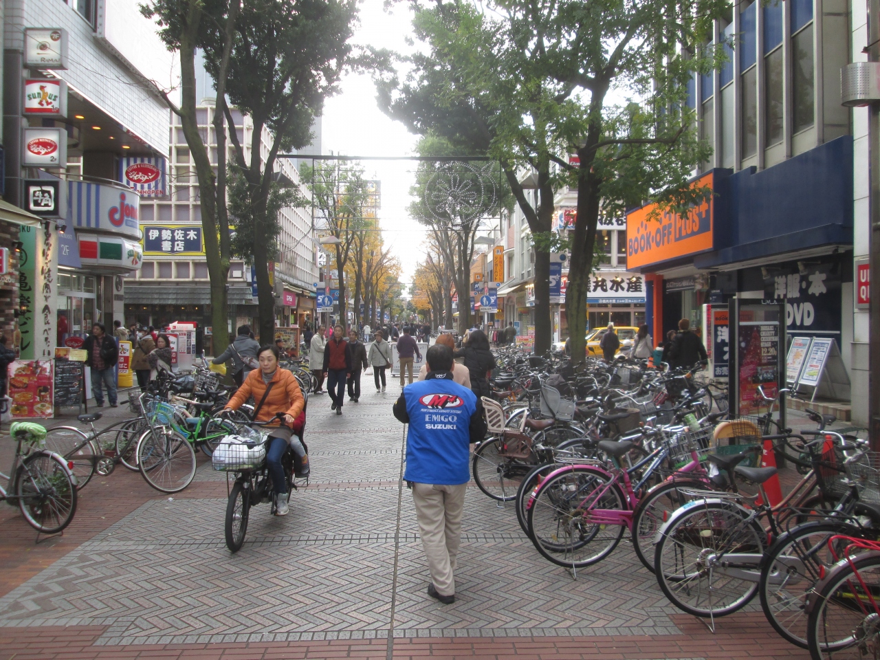 煉瓦調の通りに店舗が並んでいます。店により異なりますが、朝10時頃から開店しはじめます。商店街には自転車が多く駐機していますので、お店が開店する時間帯から係員が整備します。原則、商店街通りは自転車が通行禁止となります。