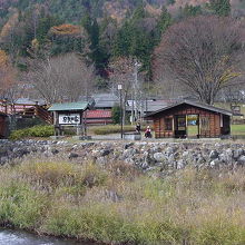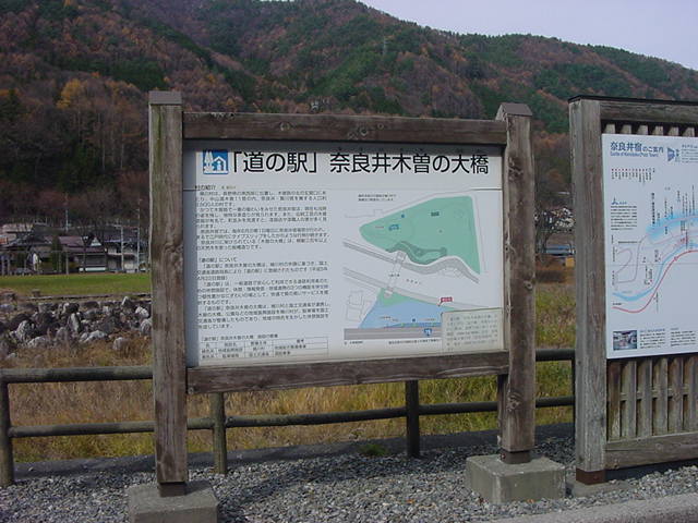 多くの観光客を集める木曽路の宿場の中でも有名な奈良井宿。宿場から川を挟んで国道が走っていますが、その国道沿いにある道の駅です。木曽ヒノキを使った木曽大橋のとなりにあります。宿場町に行くには遠いので、この道の駅の南北にある駐車場を使うのが便利です。