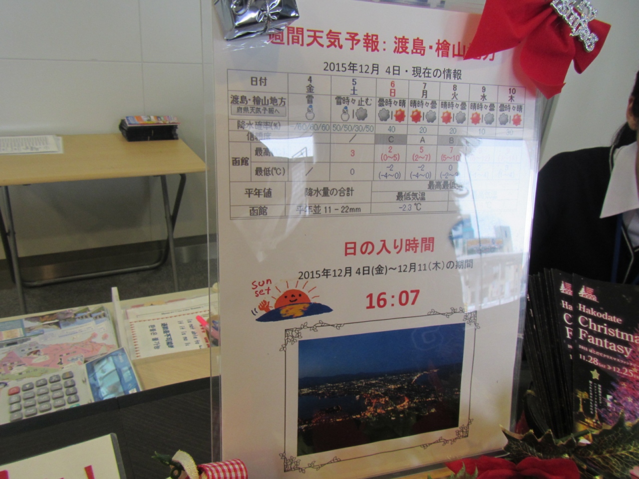 夜景を楽しむのに便利な日の入り時刻や週間天気、気温、降水・降雪確率なども掲示されています。