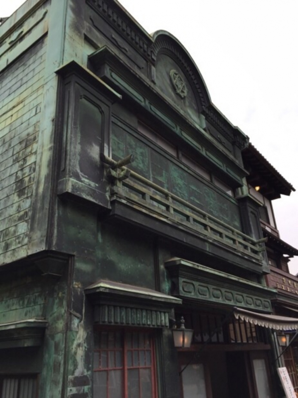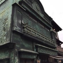 建物の前面を銅板で覆ったその姿は、いわゆる看板建築の特徴をよくあらわしている建物です。