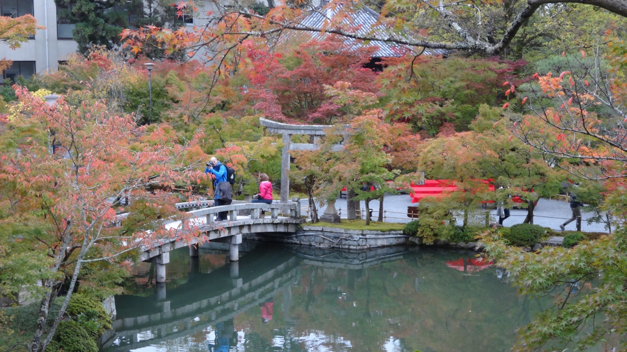 永観堂は南禅寺の近くにあります。放生池は特に紅葉がきれいです。多宝塔は割と高いところにありますので、私は開山堂あたりで諦めました。ゆっくり曲がった階段がある臥龍廊は絵になります。また、水を注ぐと水の落ちる音が琴の音のように聞こえる水琴窟も素晴らしいです。やはり、本尊は有名な「みかえり阿弥陀」ですので、向かって右横から観てください。色々見どころがります。