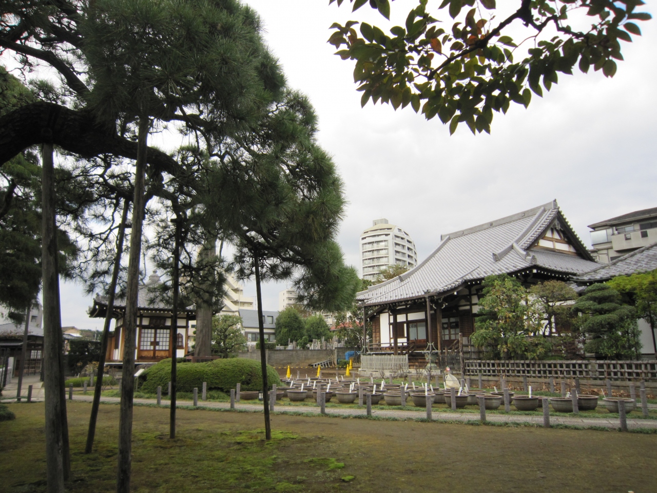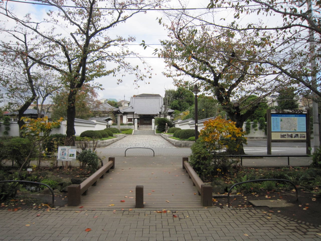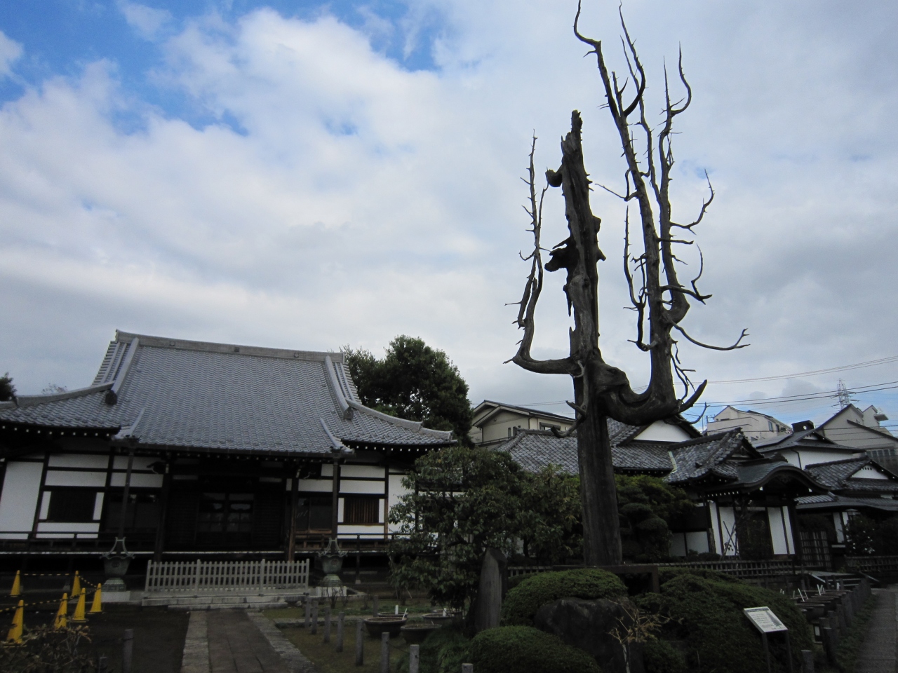 小田急線世田谷代田駅から環七通りを南へ歩くと代沢川緑道ふれあいの水辺がありその近くです。白い塀に囲まれ石畳を行くと正門があり正面が本堂、左手に観音堂があります。境内には水鉢が多数あり蓮が咲くようですが、11月末は枯れ鉢でした。また境内右手には日本庭園と池があり鯉が泳いでいました。正門直ぐの庭には枯れたコウヤマキがあり、説明板によると第二次世界大戦の空襲の戦火を浴び焼失したが戦争の痛ましさを忘れないため保存しているとありました。お寺の蓮が咲く時期は綺麗だと思います。