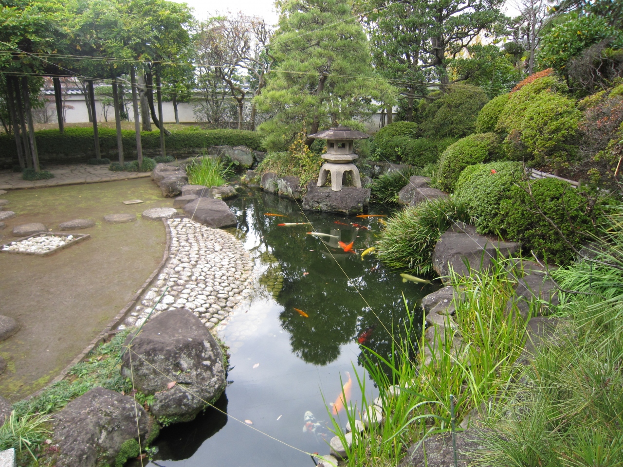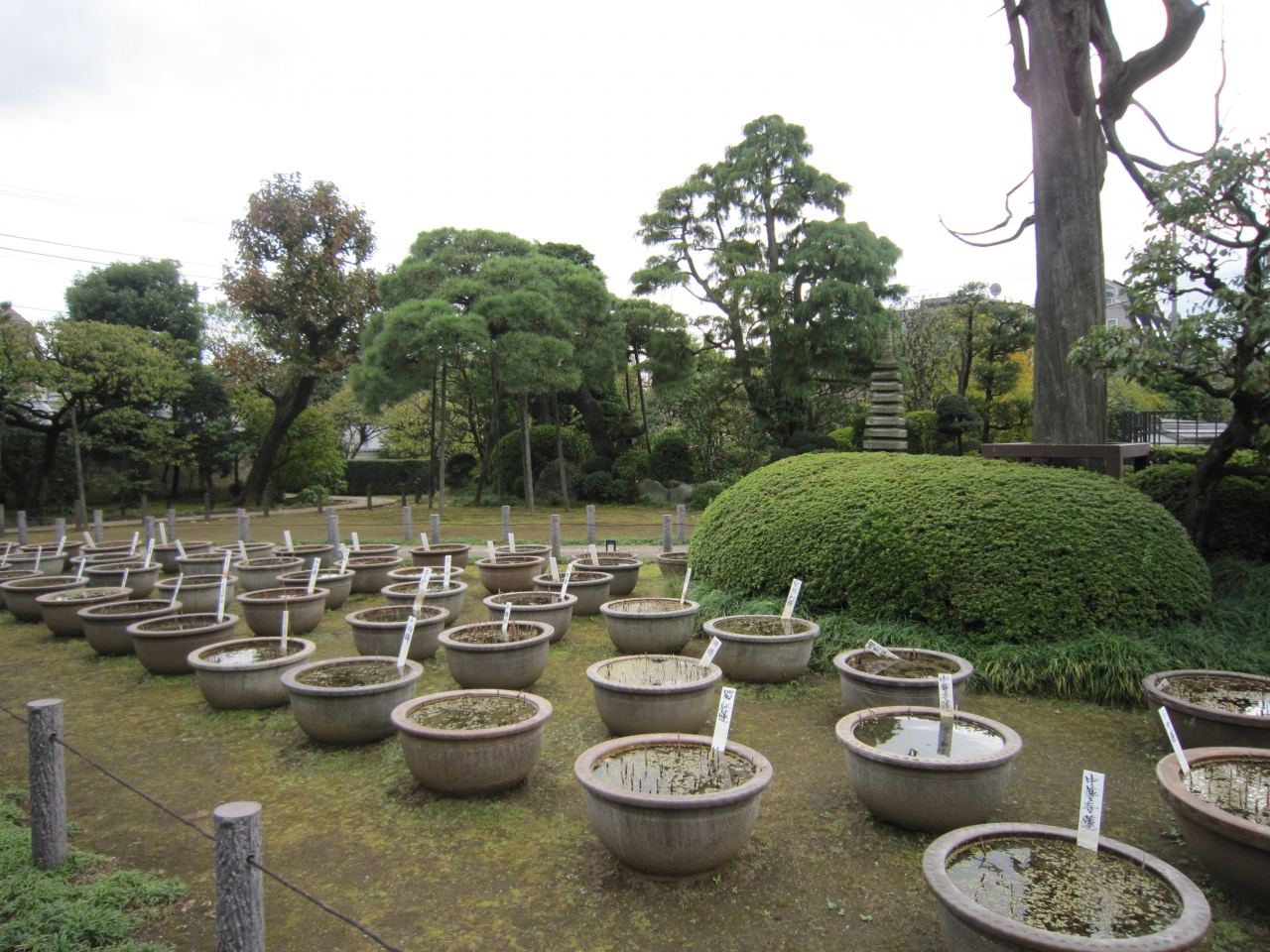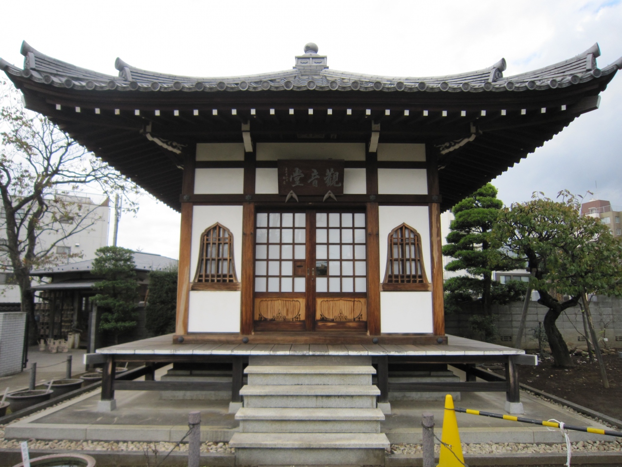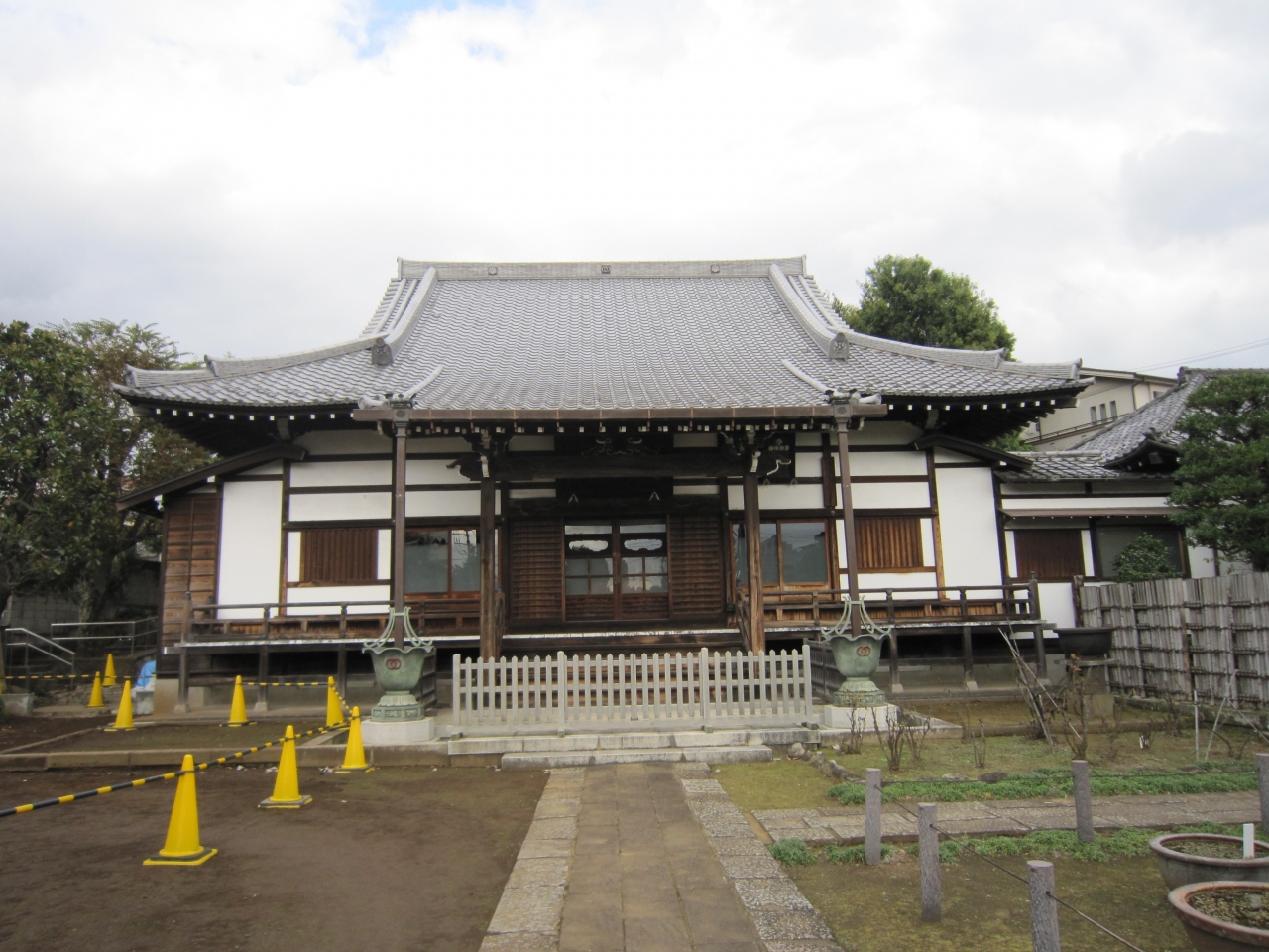 小田急線世田谷代田駅から環七通りを南へ歩くと代沢川緑道ふれあいの水辺がありその近くです。白い塀に囲まれ石畳を行くと正門があり正面が本堂、左手に観音堂があります。境内には水鉢が多数あり蓮が咲くようですが、11月末は枯れ鉢でした。また境内右手には日本庭園と池があり鯉が泳いでいました。正門直ぐの庭には枯れたコウヤマキがあり、説明板によると第二次世界大戦の空襲の戦火を浴び焼失したが戦争の痛ましさを忘れないため保存しているとありました。お寺の蓮が咲く時期は綺麗だと思います。