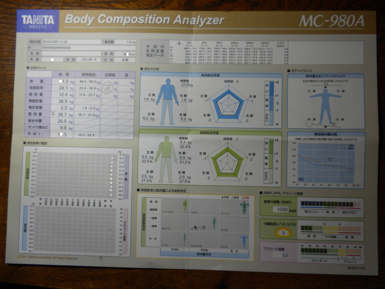 全身のデータを標準と比較して解説や部位別の筋肉量と脂肪量からボディバランスのチェックが行われます。