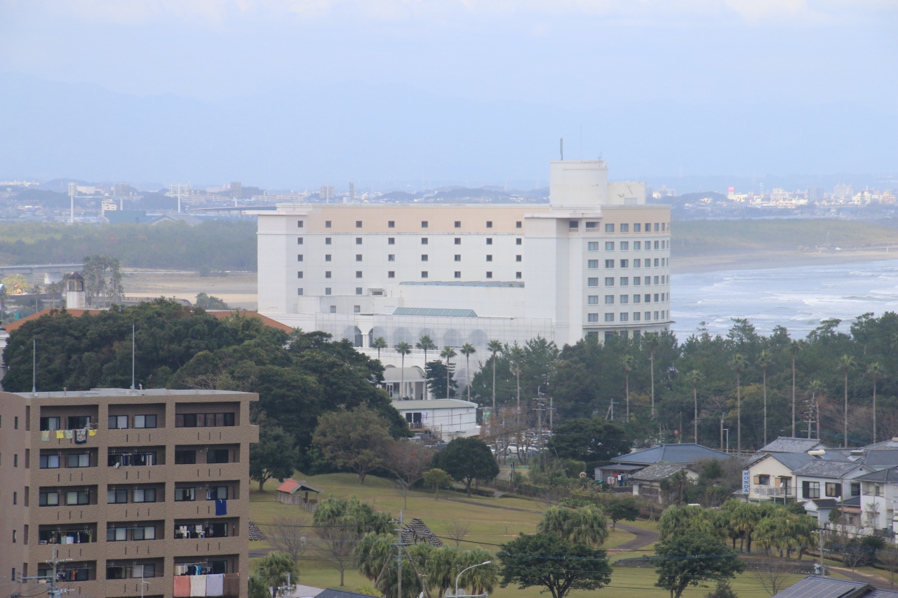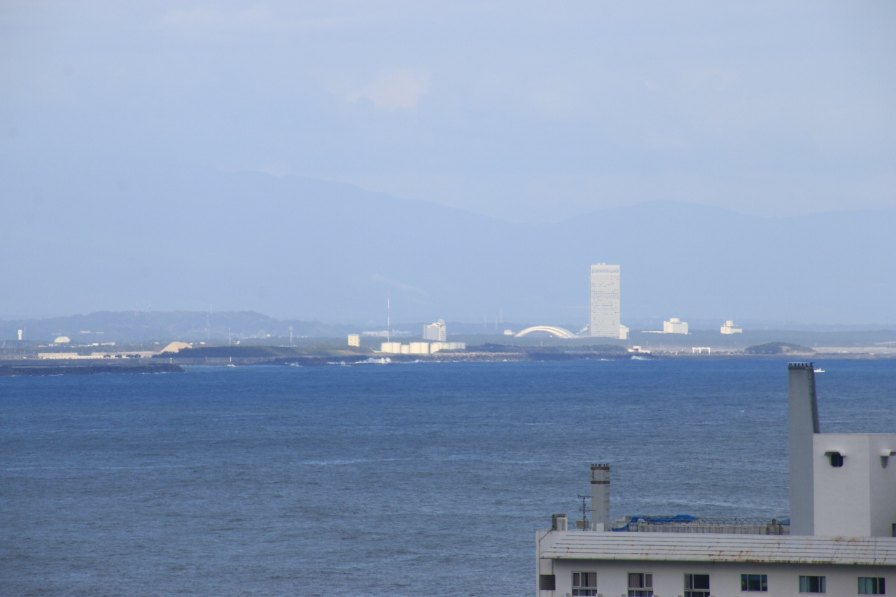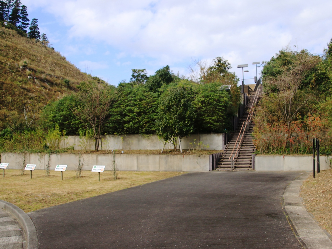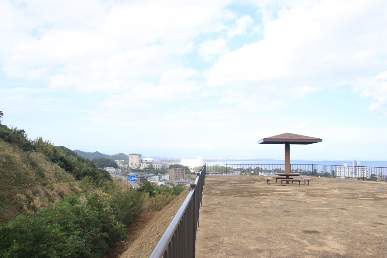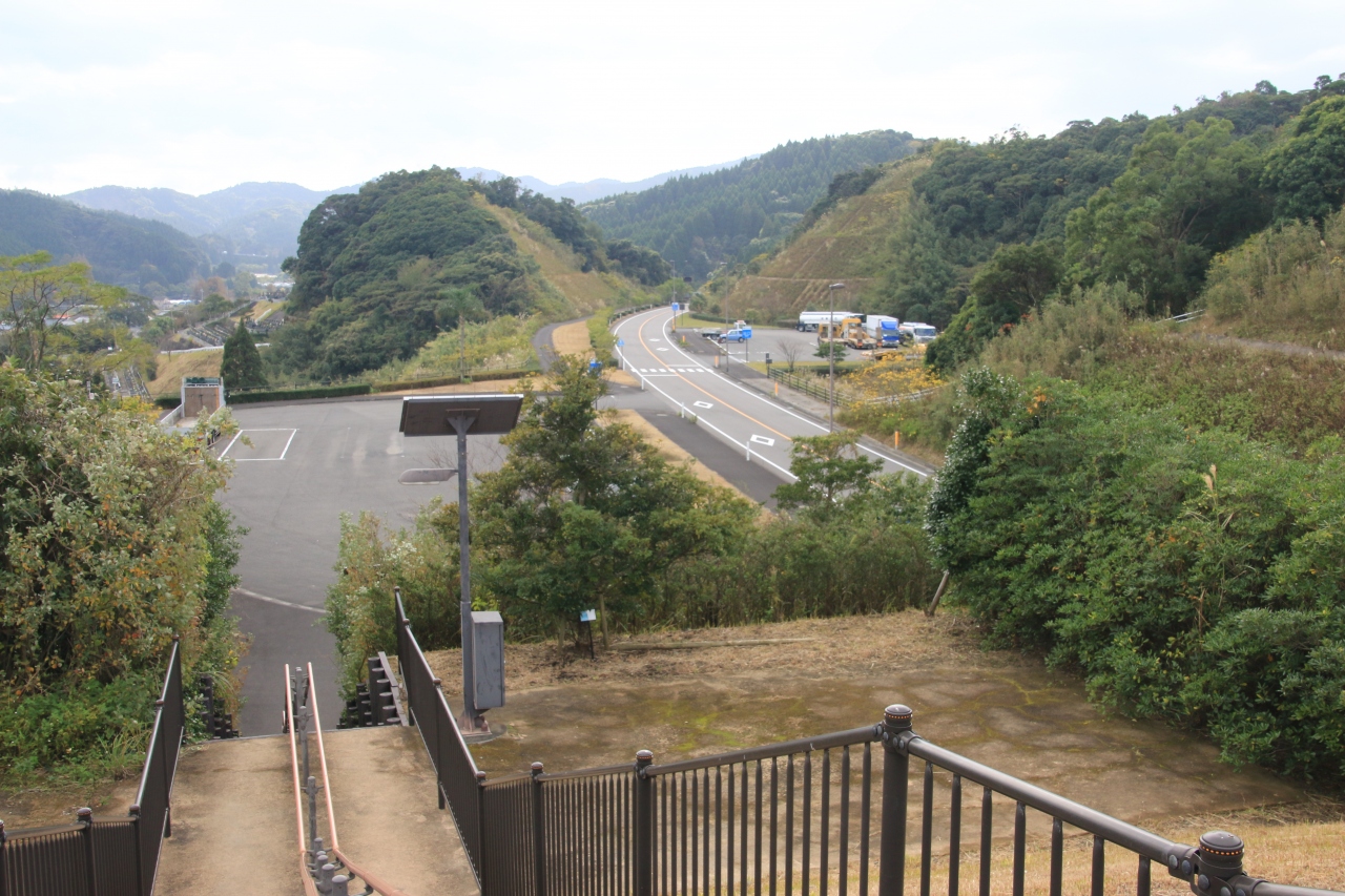 高速道路と異なりパーキングエリアといっても自販機、トイレ等は何もなく、あるのはすばらしい景観のみ。駐車場が広く、大型車の駐車も可能とあって、ビジネス客を中心に多くのドライバーが仮眠等のため休憩を取っている場所です。上下線ともにパーキングがありますが、下り車線側のパーキングからは青島地区や日向灘を望むことができ、その一角に展望台に通ずる階段がありますので、時間があったら登ってみることをお勧めします。北にシーガイアや宮崎市街地、中央部分に宮崎サンマリーンスタジアムや屋内ドームをはじめとする県総合運動公園の施設、手前から東側には青島地区や日向灘を望むことができます。