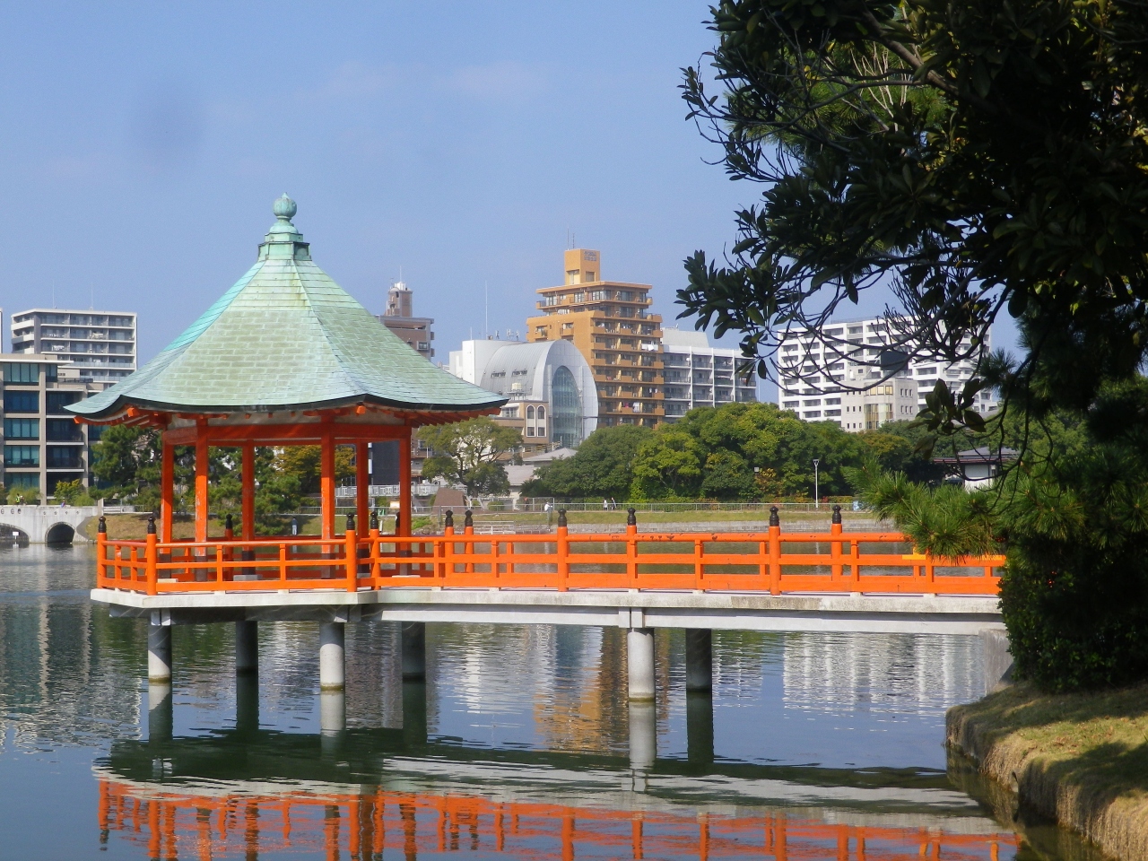 福岡を代表する大規模な公園である大濠公園の中央にある大きな池です、池の中央に遊歩道があり、観月橋、松月橋、茶村橋、さつき橋があり、浮見堂や万葉歌碑もあり、散策しながら楽しめます、湖畔に飲食が出来るショップやボート乗り場もあります、多くの市民の憩いの場として利用されています。