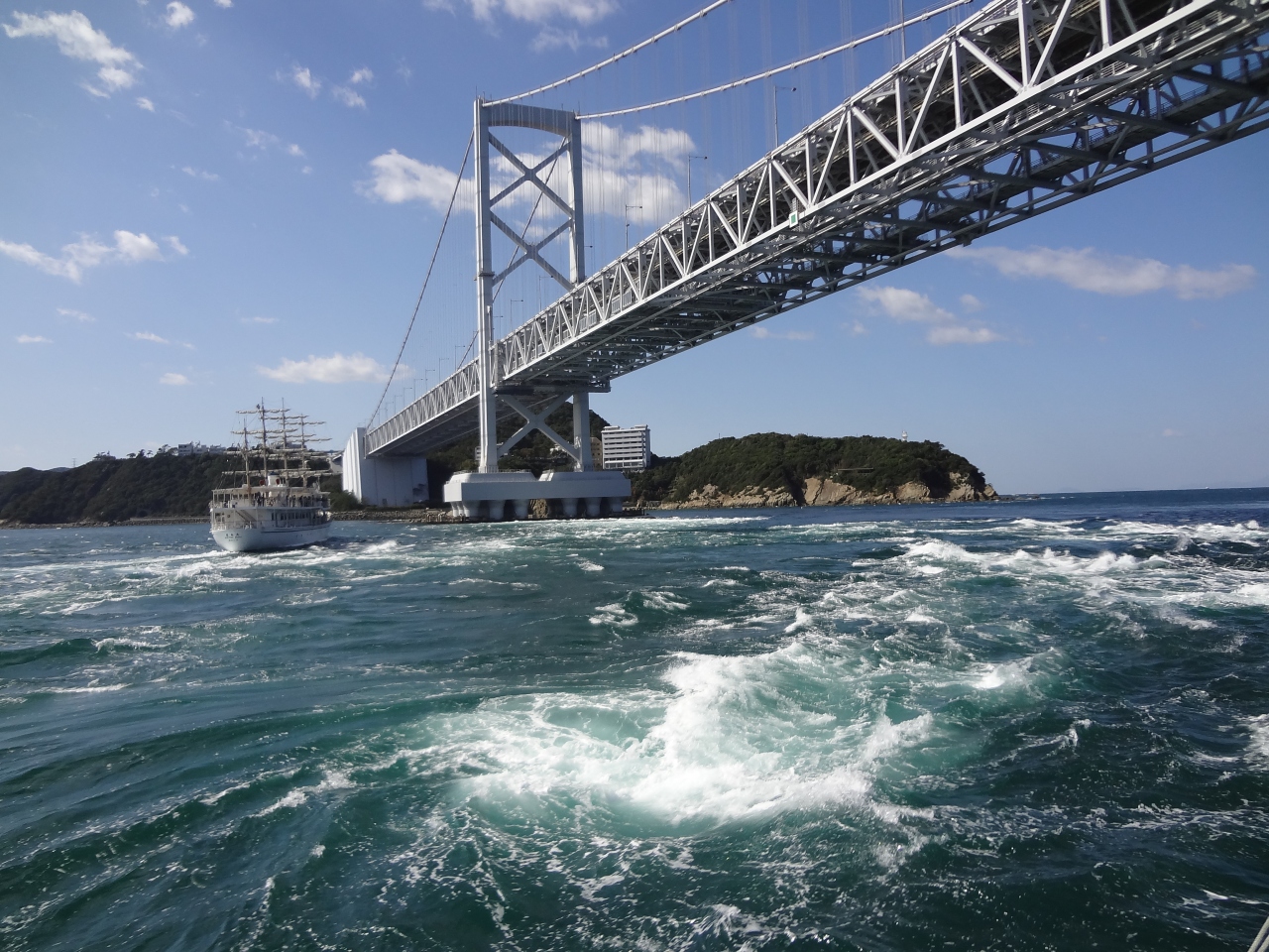 鳴門の渦潮を見学しに友達と行きました。潮見表で調べて、渦を巻く時間を狙って、観光船に乗りました。渦のすぐ近くまで接近してくれて、その迫力に、みんなで盛り上がりました。小さい船で結構揺れて、スリル満点でした。