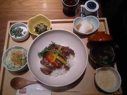 写真は 牛リブロースのステーキ丼。お肉も柔かく付け合せもあり1500円程度で満足できる量でした。