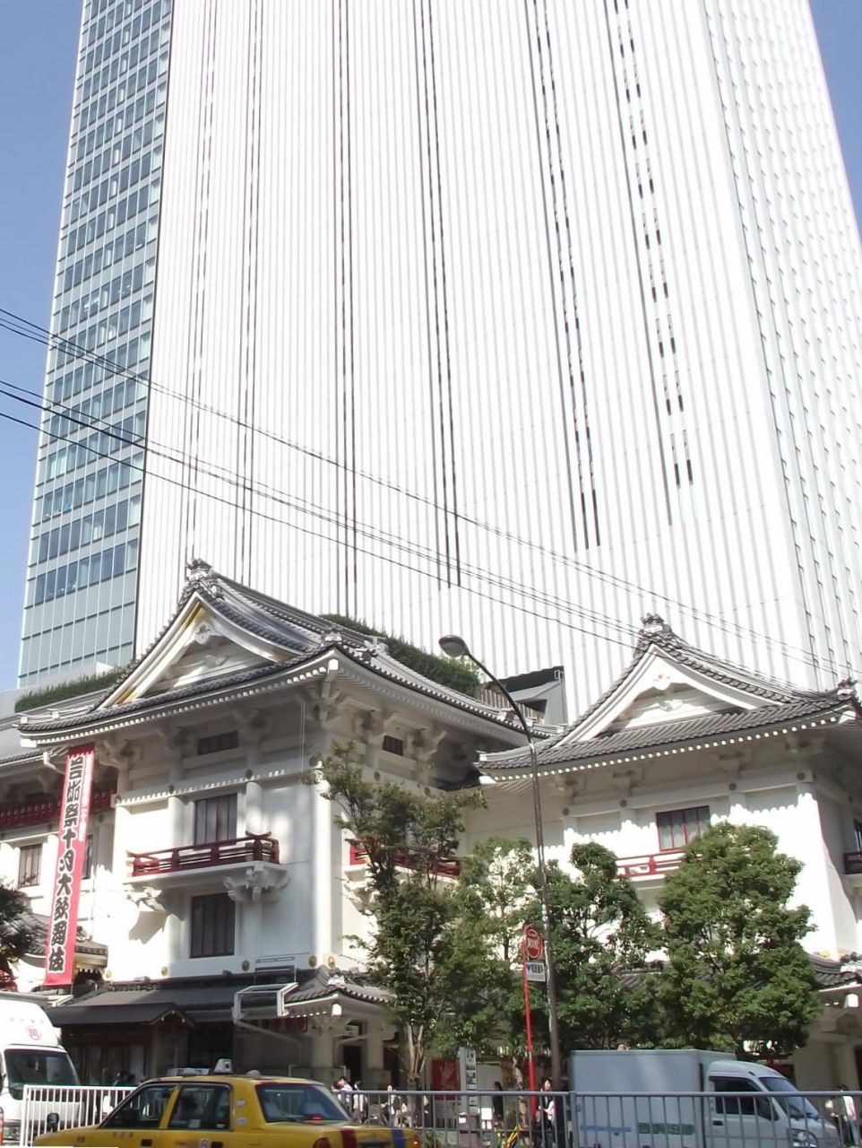 このビルの素晴らしいところは、歌舞伎座正面側から見ると、歌舞伎座の背後部分の外装が、白くすっきりとし非常にシンプルなので、歌舞伎座の白い漆喰壁や黒い瓦屋根と何ら違和感なく見ることが出来る と言うことではないかと思います。