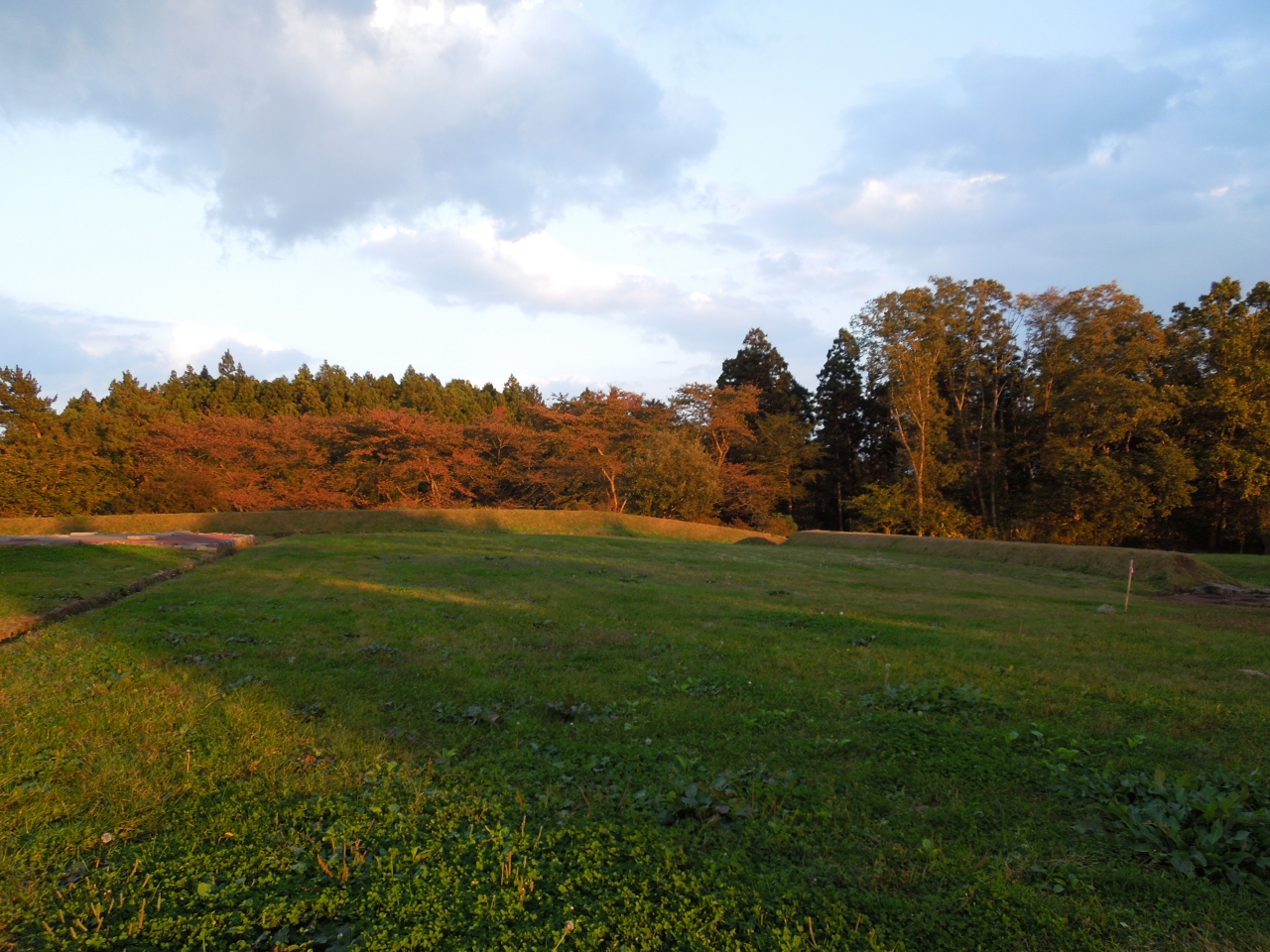 正殿跡は土台が復元されています。それしかないのですが、想像しながら見渡すと感慨深いものがあります。夕陽に紅葉がキレイでした。
