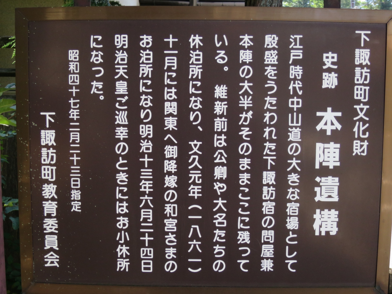 旧中山道の難所和田峠を下った下諏訪宿 甲州街道との合流点、諏訪大社下社秋宮の手前に下諏訪宿本陣があります。この本陣である岩波家は皇女和宮が降嫁の際に宿泊され、明治天皇も休憩所として利用された歴史があります。一般公開されていますが、内容的に400円はちょっと高いです。