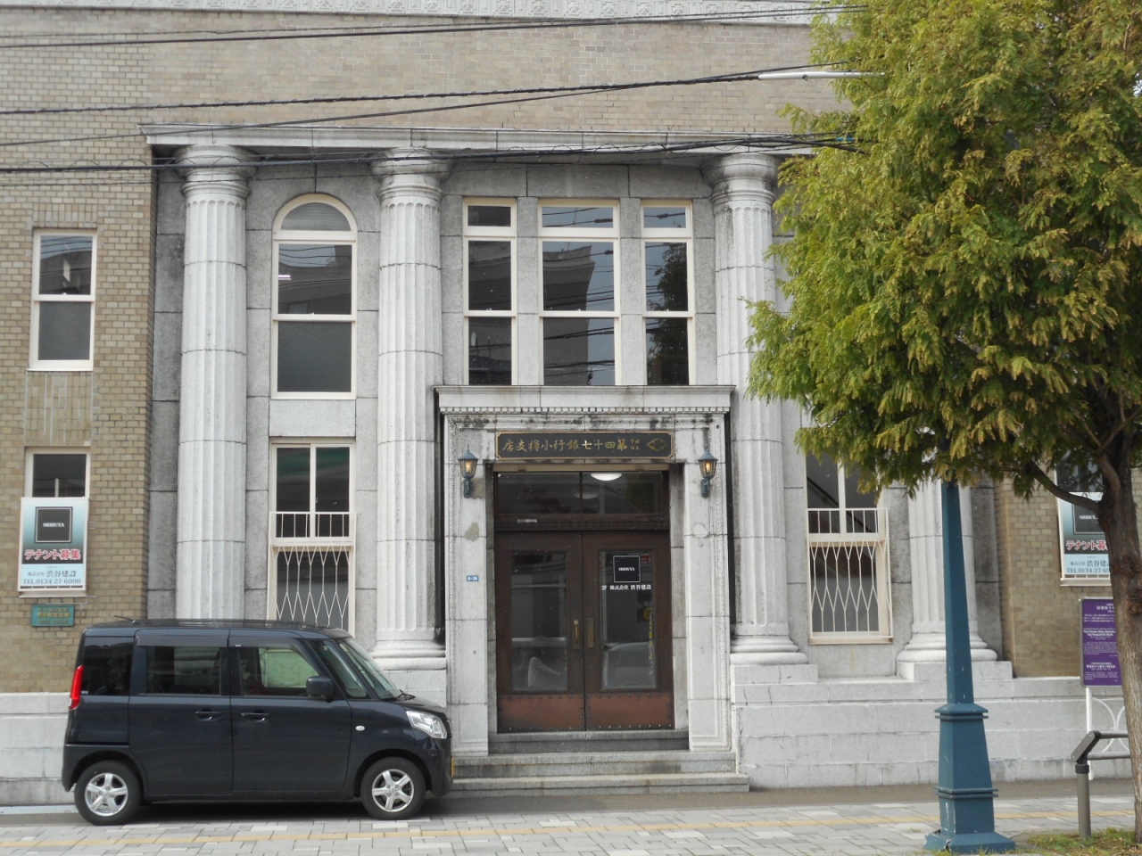 旧第四十七銀行小樽支店は、日銀通りを色内大通りに左折しほどなく左手にみえる木造2階建ての建物です。エントランス部分が石張りで4本の石柱装飾が当時のモダン建築を醸し出しています。なお、今は渋谷建設という建設会社の事務所になっていて、お仕事もして見えるようだったので中は覗けませんでした。小樽市指定の歴史的建造物です。