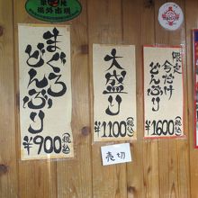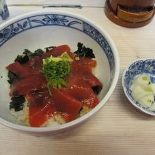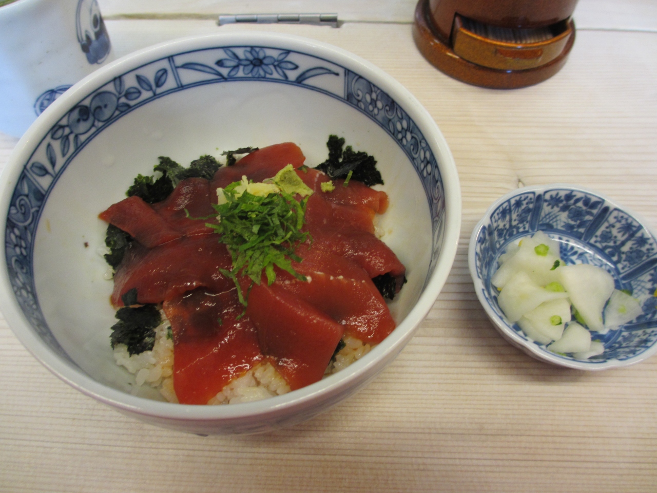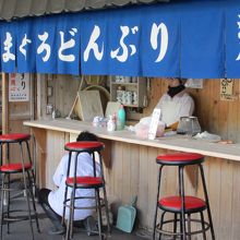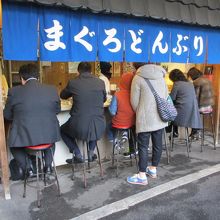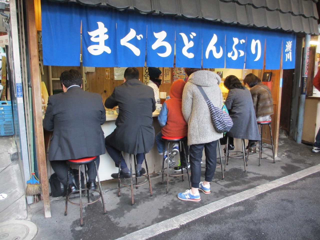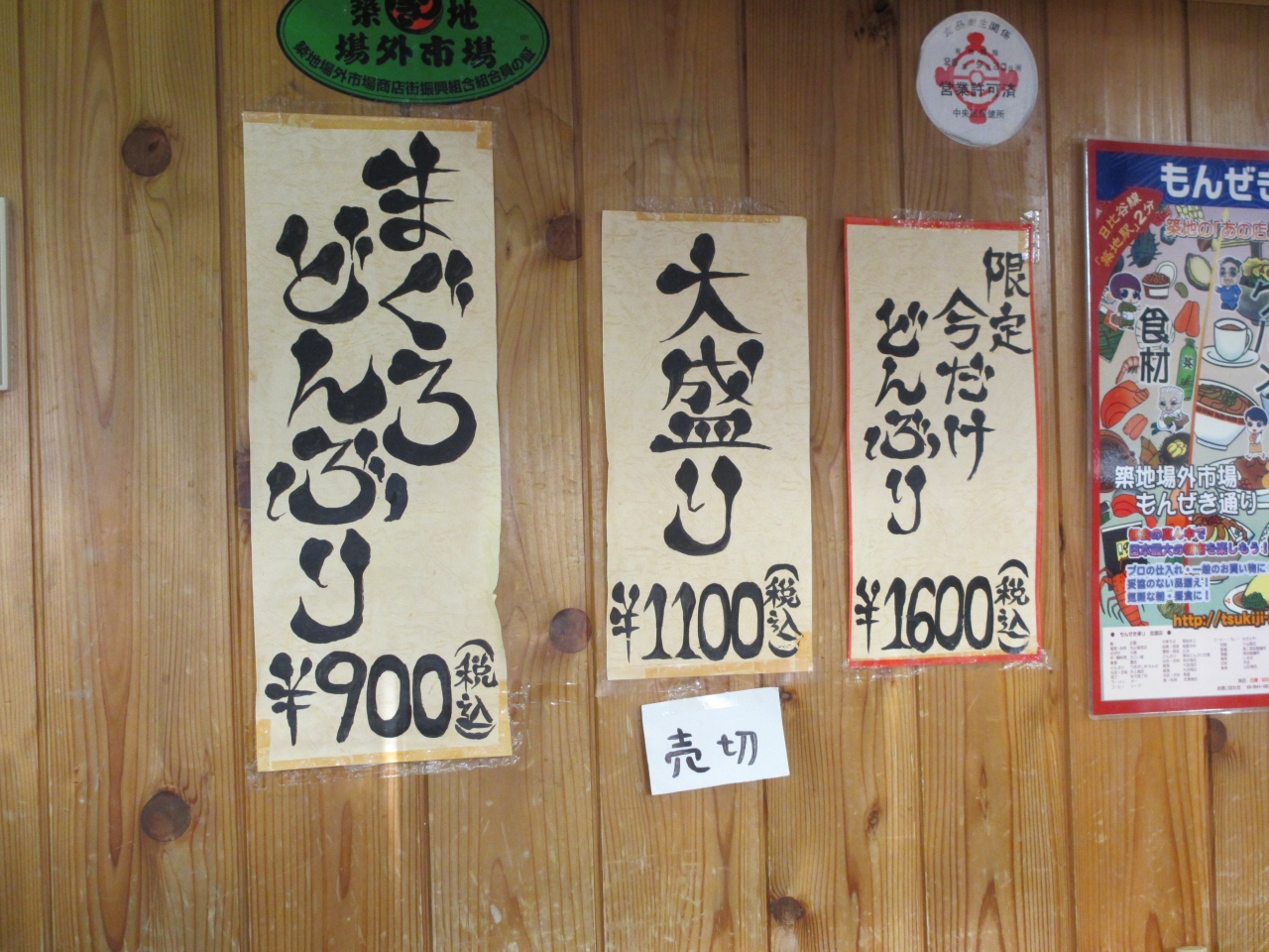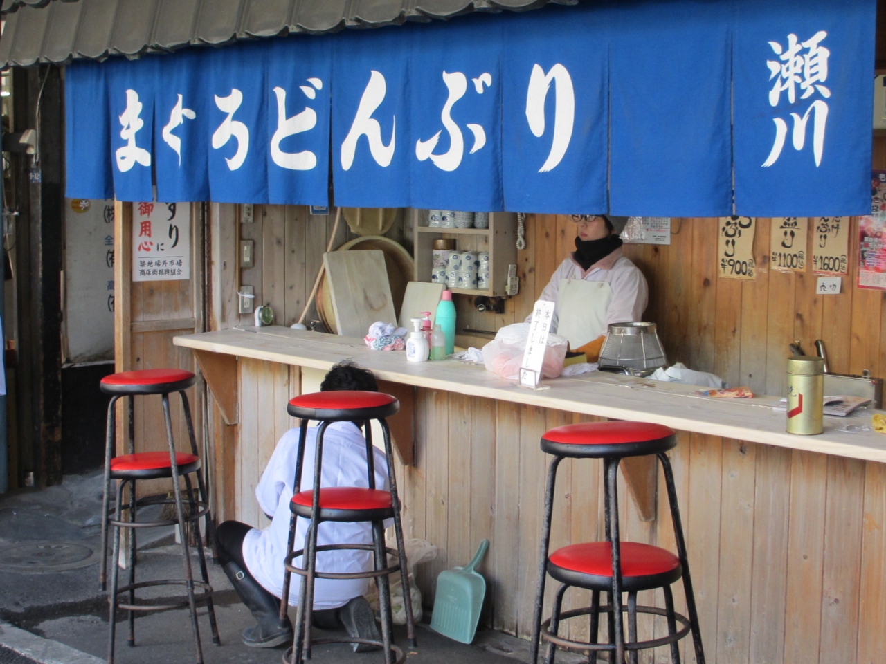 築地場外市場、もんぜき通りに面して建っているマグロ丼専門店です。メニューは基本一つだけです。雑誌・おとなの週末の覆面調査では三ツ星という最高評価を得た店です。店は歩道を背にして座るカウンター席が6席あるだけですが、食材がなくなると昼ごろには店は閉まってしまいます。畳3畳ほどのカウンター内には丼を作る人と、丼ぶりを洗う人の二人だけです。土曜日の8時半ごろに行った時は10人ほどが列を作っていましたが、20分ほどで席に着くことができました。味は保証できます。