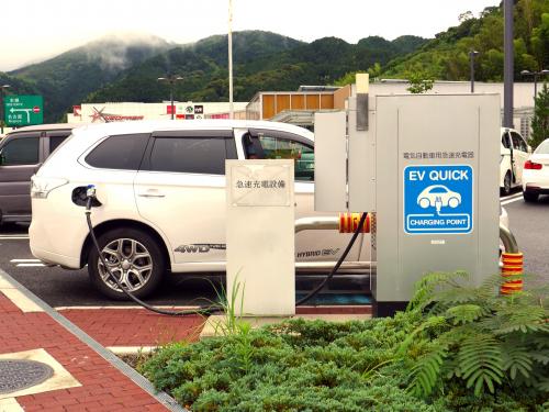 大型車84台小型車102台停められる駐車場のいい場所には、電気自動車用急速充電器が備えられ、未来志向を感じます。