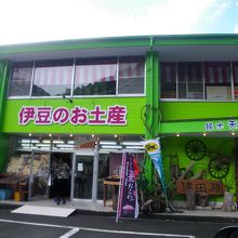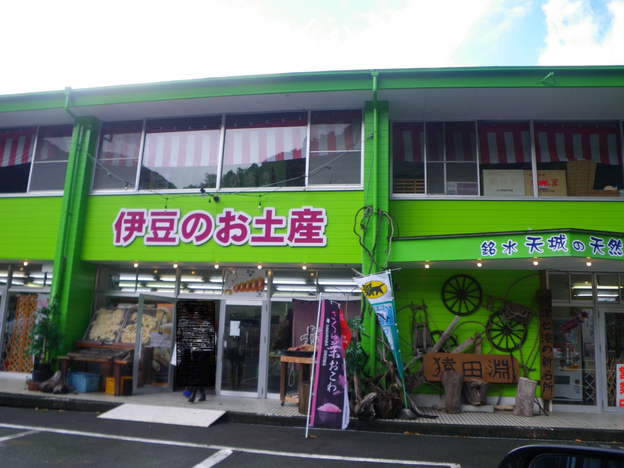 下田街道の河津七滝の近くにありました。外壁がきみどり色なのでわかりやすいと思います。天日干しの自家製ひものや生わさびなど、伊豆ならではの土産品が揃っていました。天城の天然水を使用したそばうどんが食べられる食事処もありました。