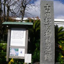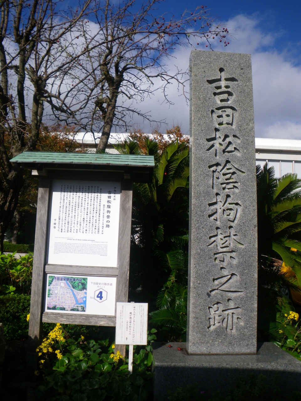 下田開国博物館の近く、現在の下田公民館の前に石碑がありました。ここはかつての宝光院長命寺の跡地で、海外渡航に失敗した吉田松陰と金子重輔が拘禁されていた場所です。拘禁されたのは正座の状態でふたりの膝が重なるほど狭い場所だったそう。
