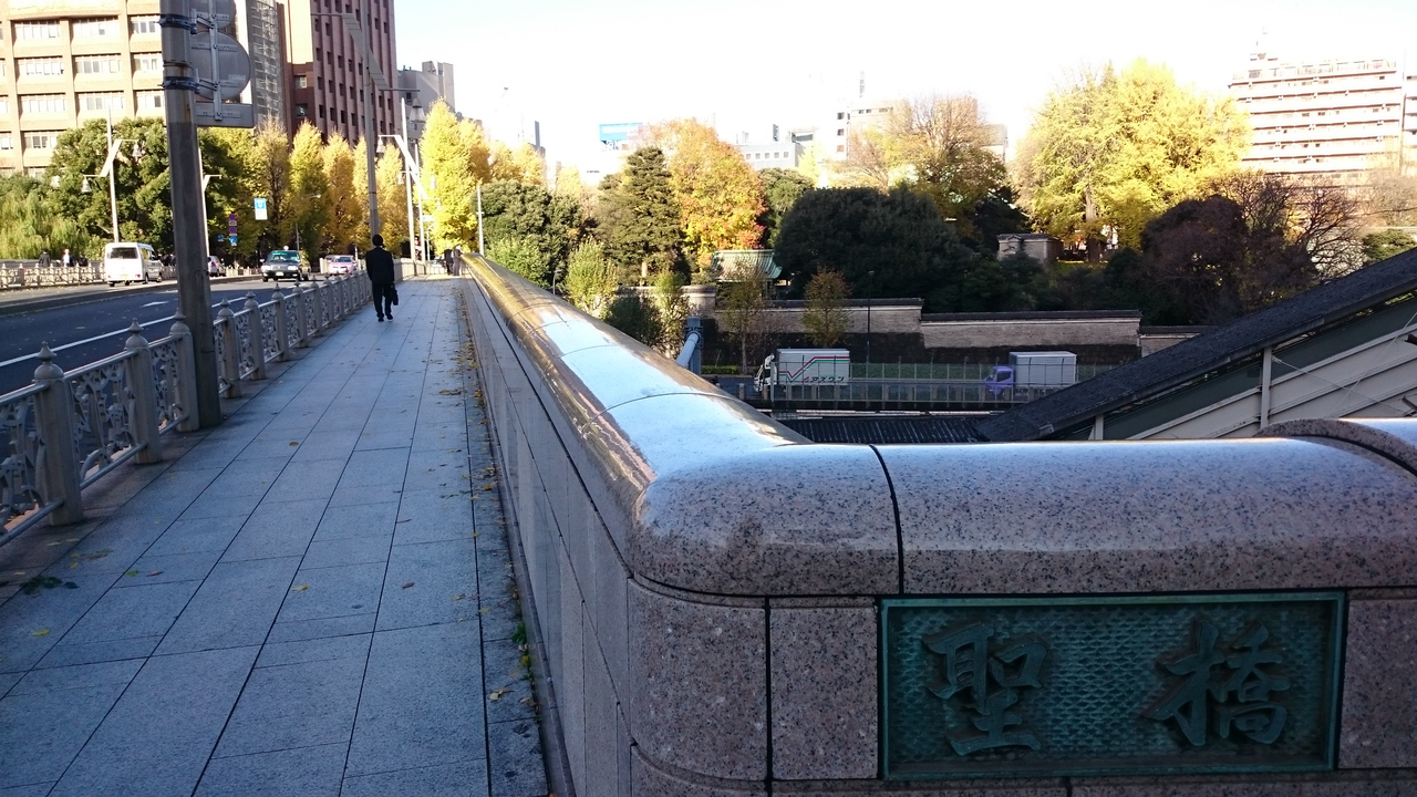 御茶ノ水駅の改札をでてすぐ、この橋のところで風景に目を奪われました。雨上がりの強い日差しが黄色く色づいたイチョウに降り注ぎ、美しさを引き立てています。木々の間に湯島聖堂、上に高層ビルも見えて、東京らしい風景だと感じました。