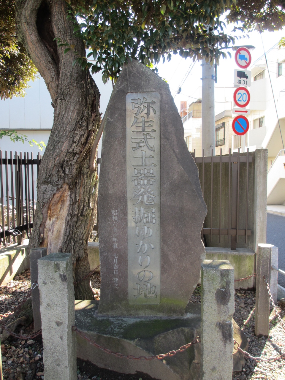 根津駅から徒歩4分です。東京大学浅野キャンパスの外、言問通りに面した所にこの碑があります。向ヶ岡弥生町の数カ所から初めて弥生式土器が出土発見され、町名を冠して「弥生式」と名付けられました。弥生式土器、向ヶ岡遺跡の発見によって弥生時代という文化期の存在が知られました。このような経緯から記念碑が向ヶ岡弥生町会有志により建てられました。