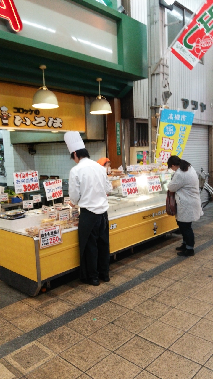 阪急高槻市駅すぐの高槻センター街の市場にあるいろはで、テイクアウト専門店です。その場で揚げたコロッケを売っており、ノーマルなものからカレーや枝豆、クリームコロッケなどいろいろとあります。7時頃だと割引したものも結構売っているのでお得ですね。