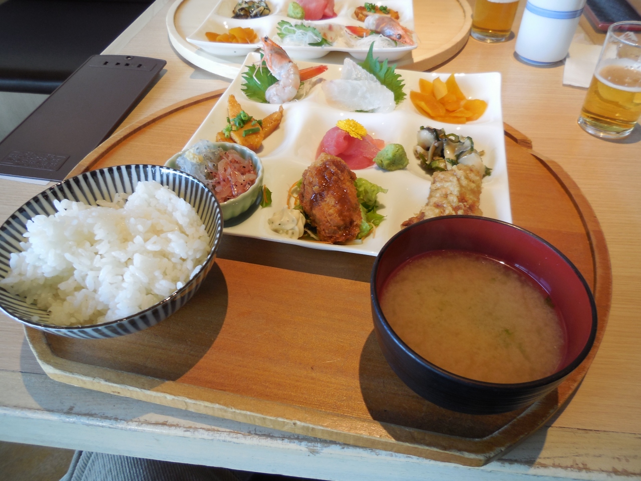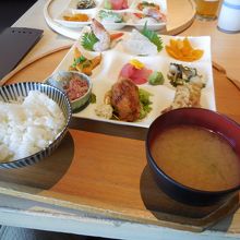 マグロ、エビ、アジなどの多様なおかずが食べられ、ご飯とみそ汁が付いて1500円でした。価格は観光地料金ですが、それなりに美味しかったですし、沼津内港を眺めながらゆったりと食事ができました。