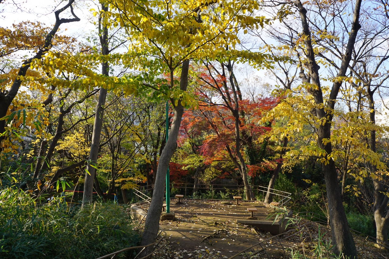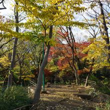 加賀前田家下屋敷跡は、石神井川に面した加賀公園となっています。中央にかつての屋敷内庭園の築山の一部が残っていて、これが当時の様子をしのべる遺構。木々が色づいて、いい感じ。石段を登っていく遊歩道があるので、これがお勧めです。
