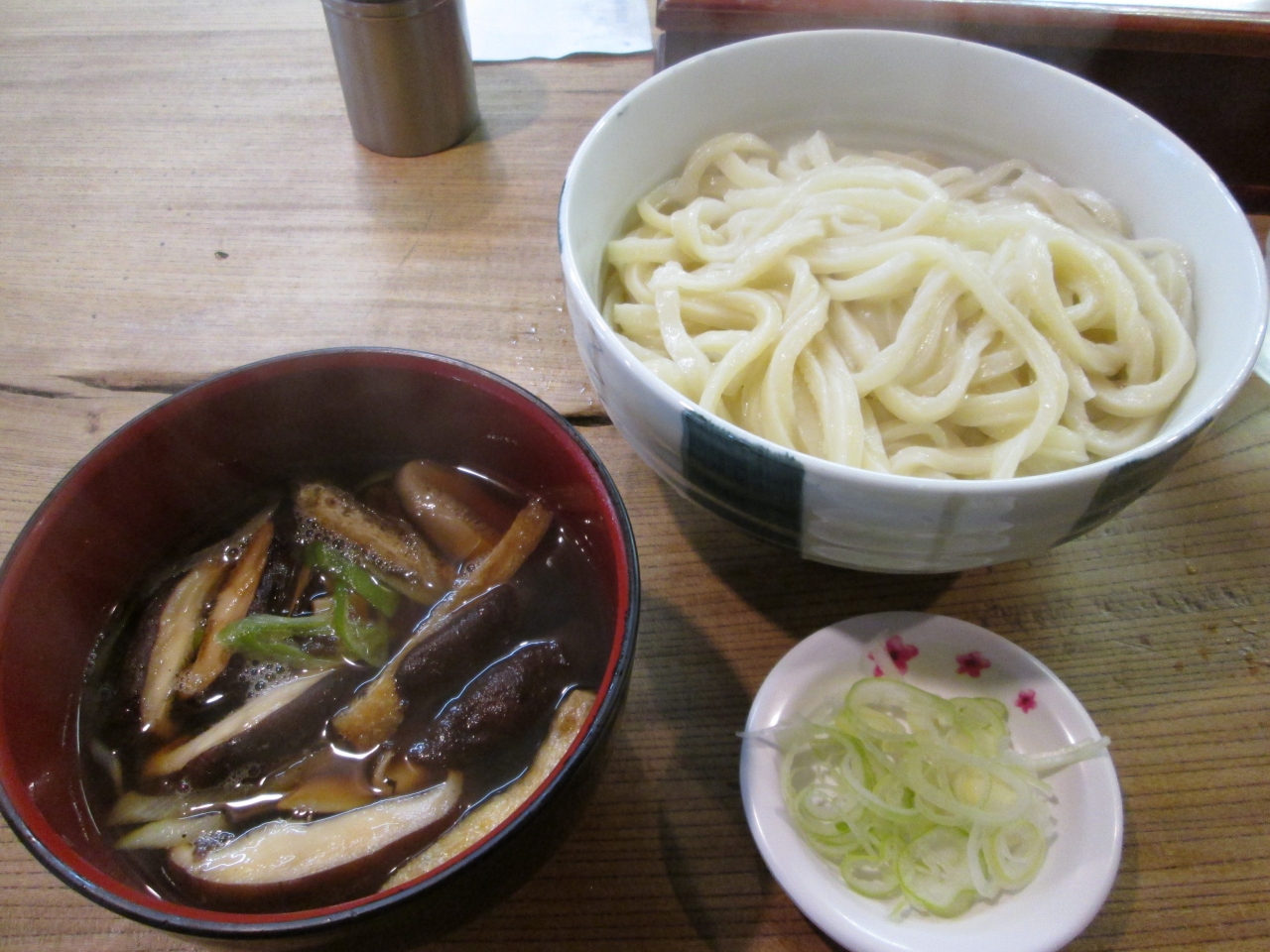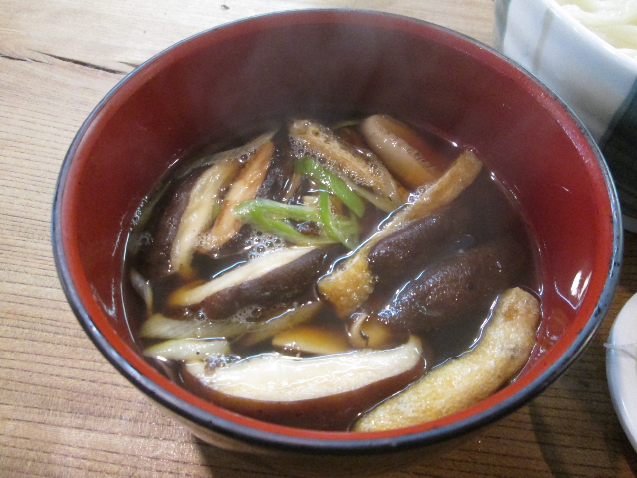 きの子汁のうどんが名物なので、これをオーダー。大盛りうどんに、冬なのであつもりを選択。めんは太麺で歯ごたえにモチモチのうどんです。特にあつもりだからモチモチなのかもしれません。食べ終わる前に茹で湯がでてきました。