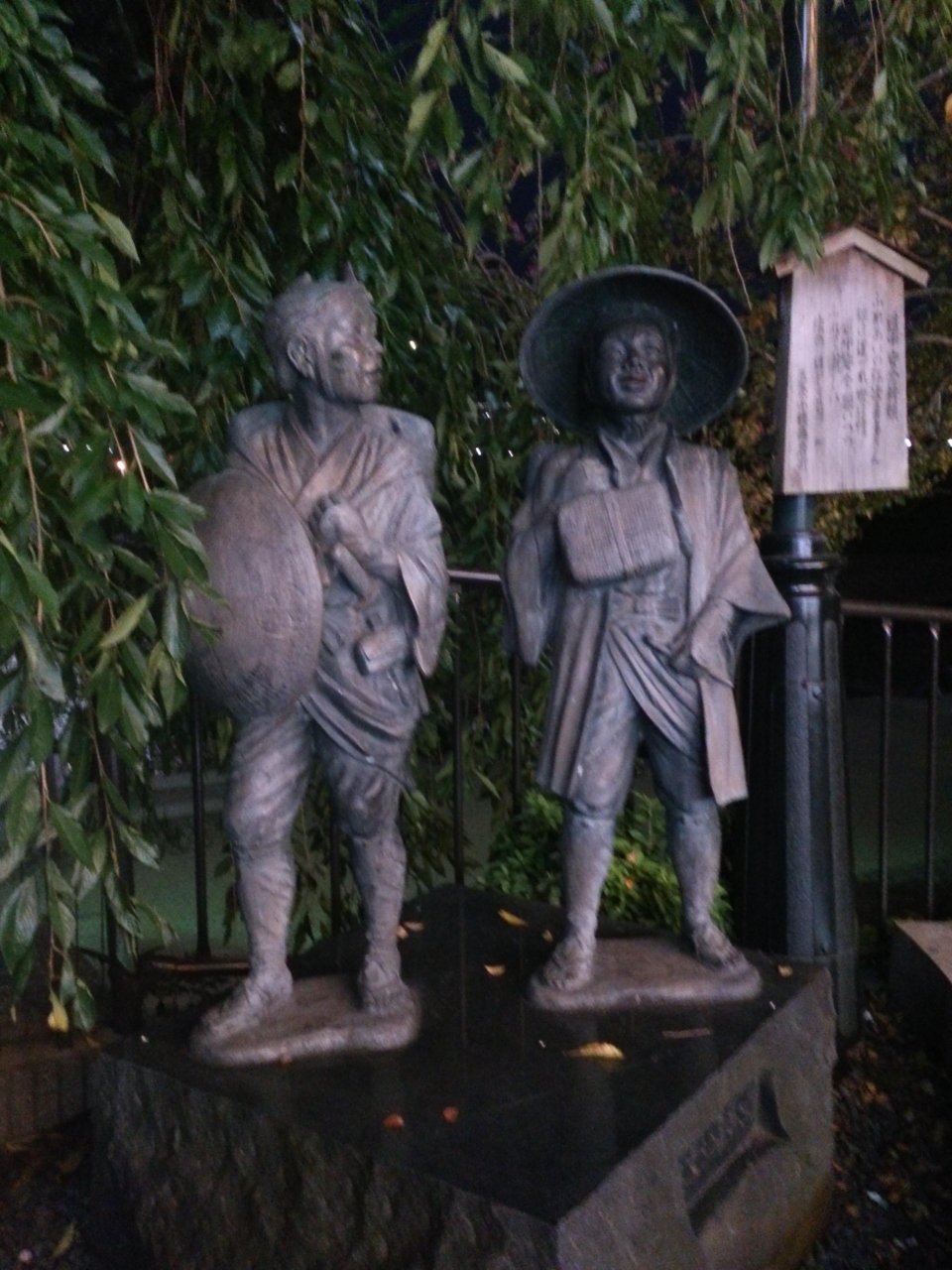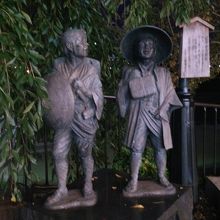 京都の三条大橋に弥次喜多像があります。弥次喜多道中記の主人公ですね。江戸の日本橋から京都の三条大橋までが当事の東海道であったことを感じさせるものになっています。もう少し説明があるとわかりやすくて良いんですけどね。
