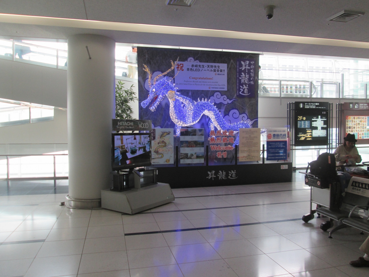 中部国際空港に到着するとLEDの昇龍道が展示されていました。赤崎先生、天野先生が青色LEDでノーベル賞を受賞した記念に展示されたようです。名古屋に到着した海外観光客を中部、北陸の旅へ誘うキャンペーンでもあり、中国語、英語、韓国語で解説がありました。