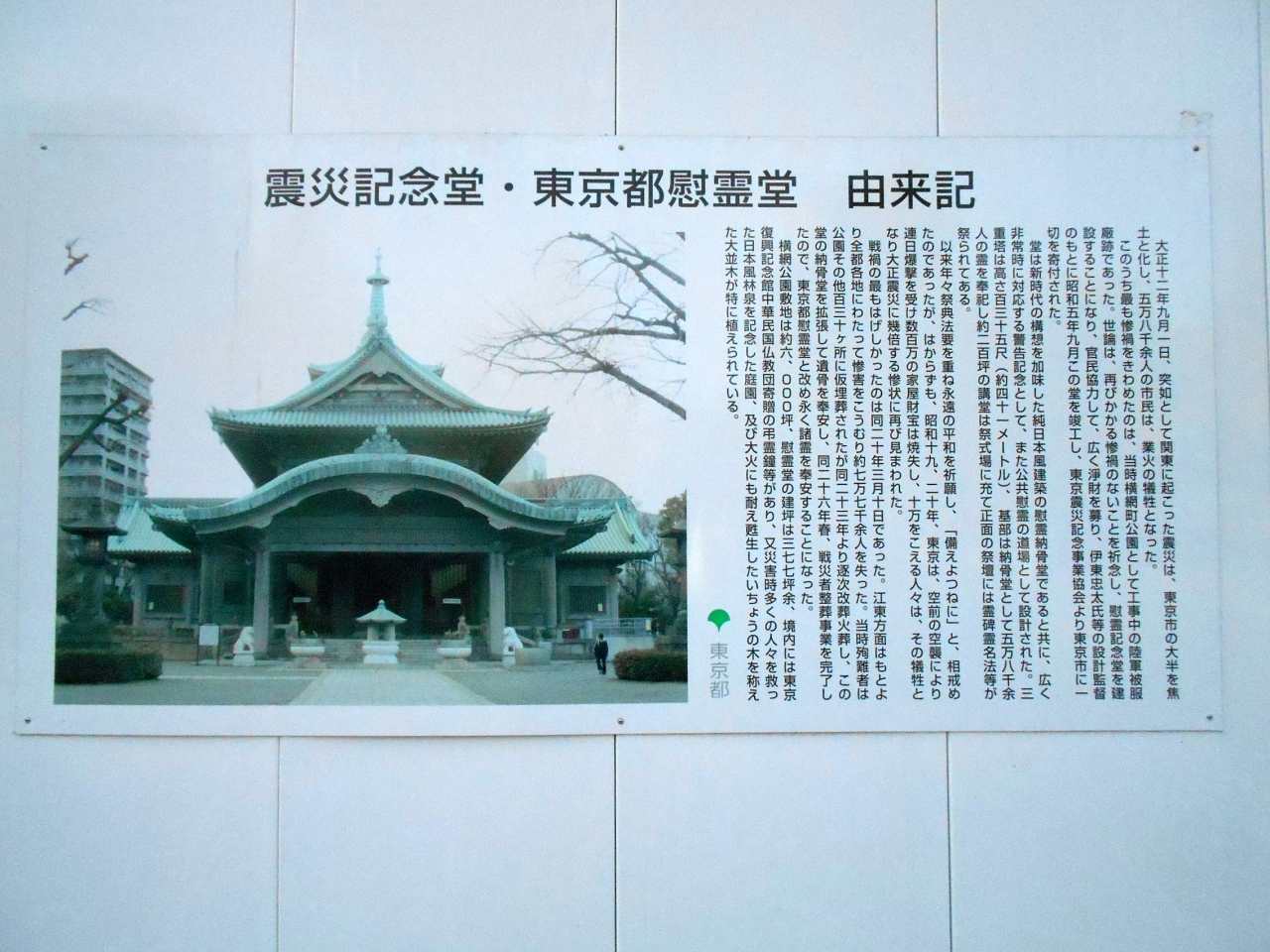 関東大震災における悲劇の場である「横網町公園」内に建てられた「東京都慰霊塔」です。昭和5年に竣工したと思えないほど美しく保たれた建物に入ると、徳永柳州画伯による関東大震災の惨禍を描いた絵画、また石川光陽氏によって撮られた東京大空襲の被害状況を表わす写真が掲げられ、それを目にするだけでも、なかなかショックを受けます。一度は足を運んでほしい場です。