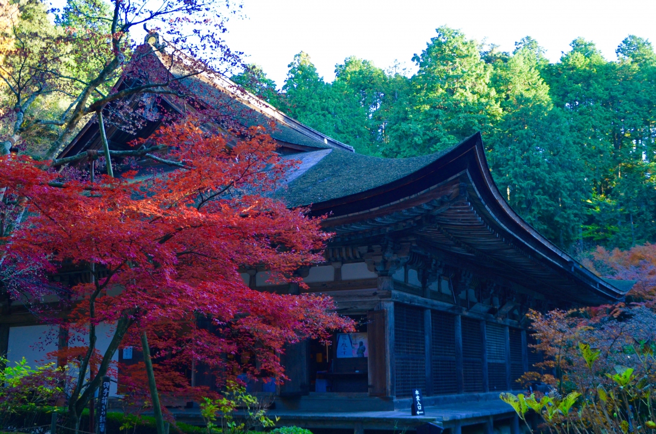鈴鹿山脈の麓にある、もう一つの紅葉の名所である金剛輪寺。西明寺、百済寺とともに湖東三山の1つに数えられ、開基は行基、創建は740年頃と言われる。境内は広大で石段を10分ほど登ったところに国宝の本殿がある。その左側には「血染めの紅葉」と少々物騒な名が付けられた紅葉が、その名のごとく真っ赤な色を楽しませてくれた。また本殿内の、平安後期から鎌倉時代に作られた8体の仏像が重要文化財に登録されている。