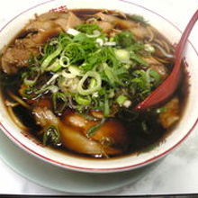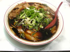 京都駅から少し歩くが、徒歩圏内にあります。店内はそんなに広くなく街の中華屋さんといった感じ。ラーメンはまずスープが黒く、想像通り醤油味でしょっぱいです。チャーシューはボリュームあり、ネギもどっさり入っており食べ応えあるラーメンです