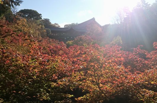 東福寺に紅葉狩りに行き、最初に目にしたのが臥雲橋からの紅葉でした。目の前に広がる木々、奥には通天橋が望めます。真っ赤に色づいていれば最高だったはず、紅葉の最盛期でなかったことが残念でした。