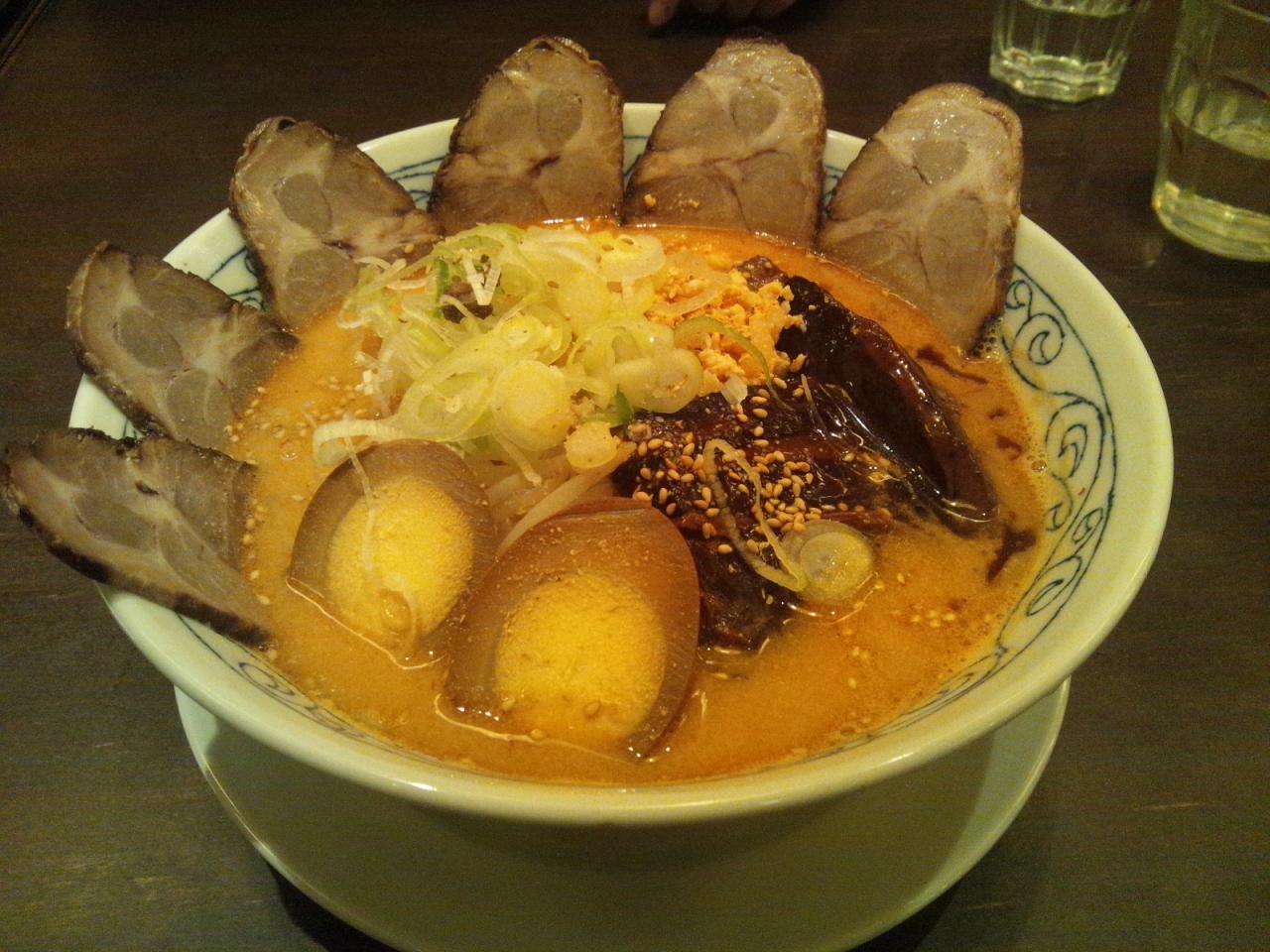 豪華坦々麺は、具がたくさん入っており、煮タマゴと肉がドンと入っています。