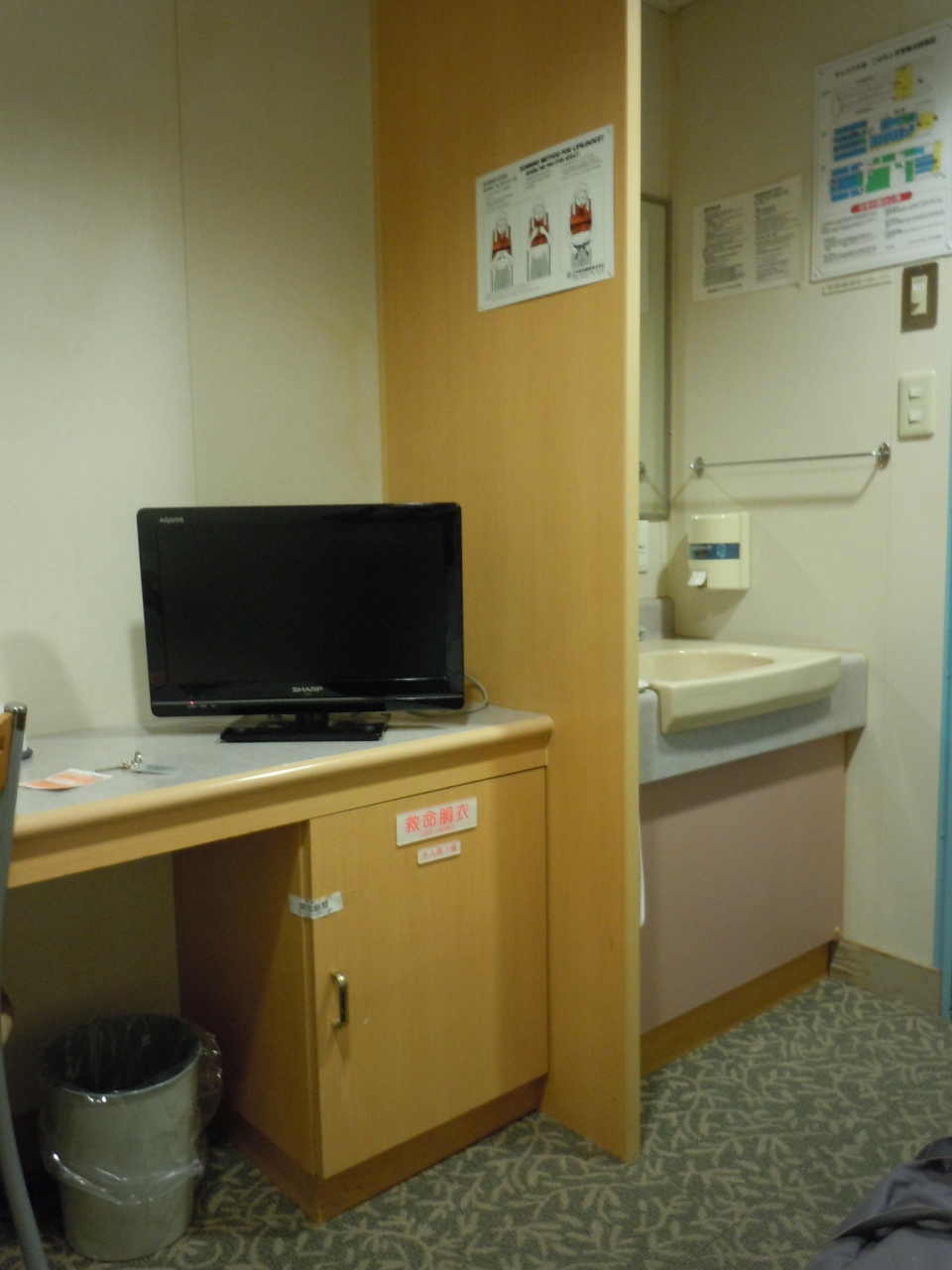 弾丸フェリーなどさまざまなお手軽料金プランがあるが、船に泊まろうプランで、車なしスタンダード1人個室で12600円とお得、デラックスとの違いは窓がない個室という点だが、洗面、テレビ、机が個室内にあり便利。