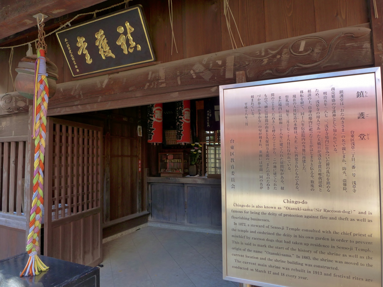 浅草寺へ向かう参道の仲見世通りと交差する伝法院通りに面していて、門を潜ると左手にお堂があってお堂の脇には狸の像がありました。