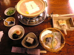 京都に来たからには湯豆腐を食べたいと思い、【南禅寺順正】に行きました。店は昔ながらの日本家屋で庭もきれいです。畳敷きの広い部屋でした。湯豆腐定食はメインは土鍋に入った湯豆腐で、あとは田楽や天ぷらなど小鉢がついています。湯豆腐は1人分でかるく1丁はあるので、食べきれないくらいです。