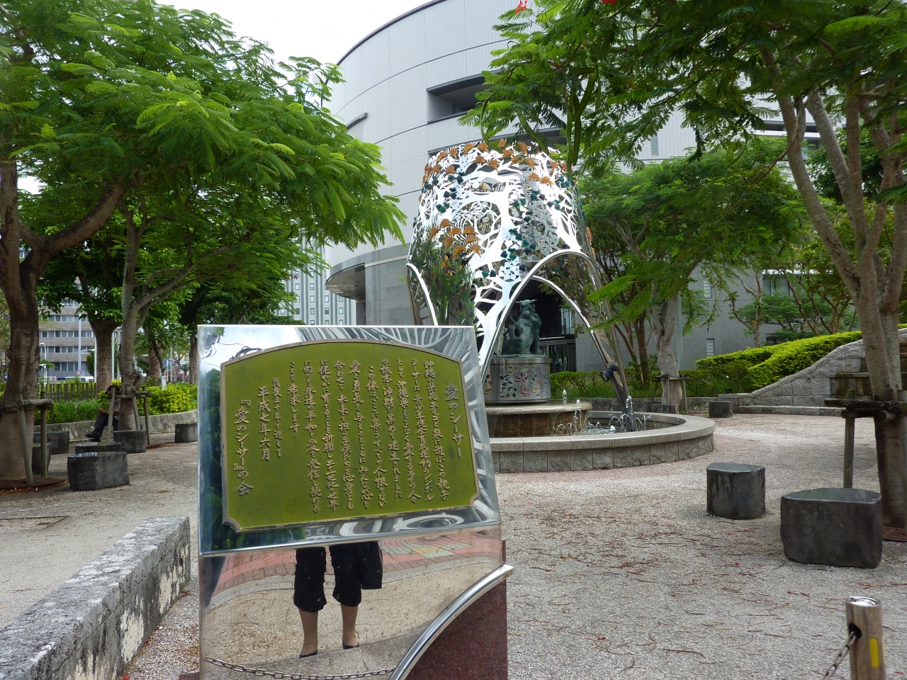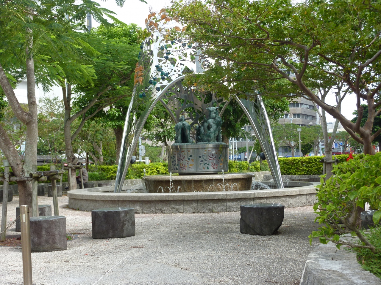 那覇市役所から国際通りを向くと角に胸にピンクのハートを付けた赤いシーサーが居る所が公園の入り口です。細い通路の先にはデイゴの木と噴水があり、噴水の中には親子3頭のシーサーがオブジェに囲まれています。噴水の回りは綺麗に整えられ石のベンチも配置されています