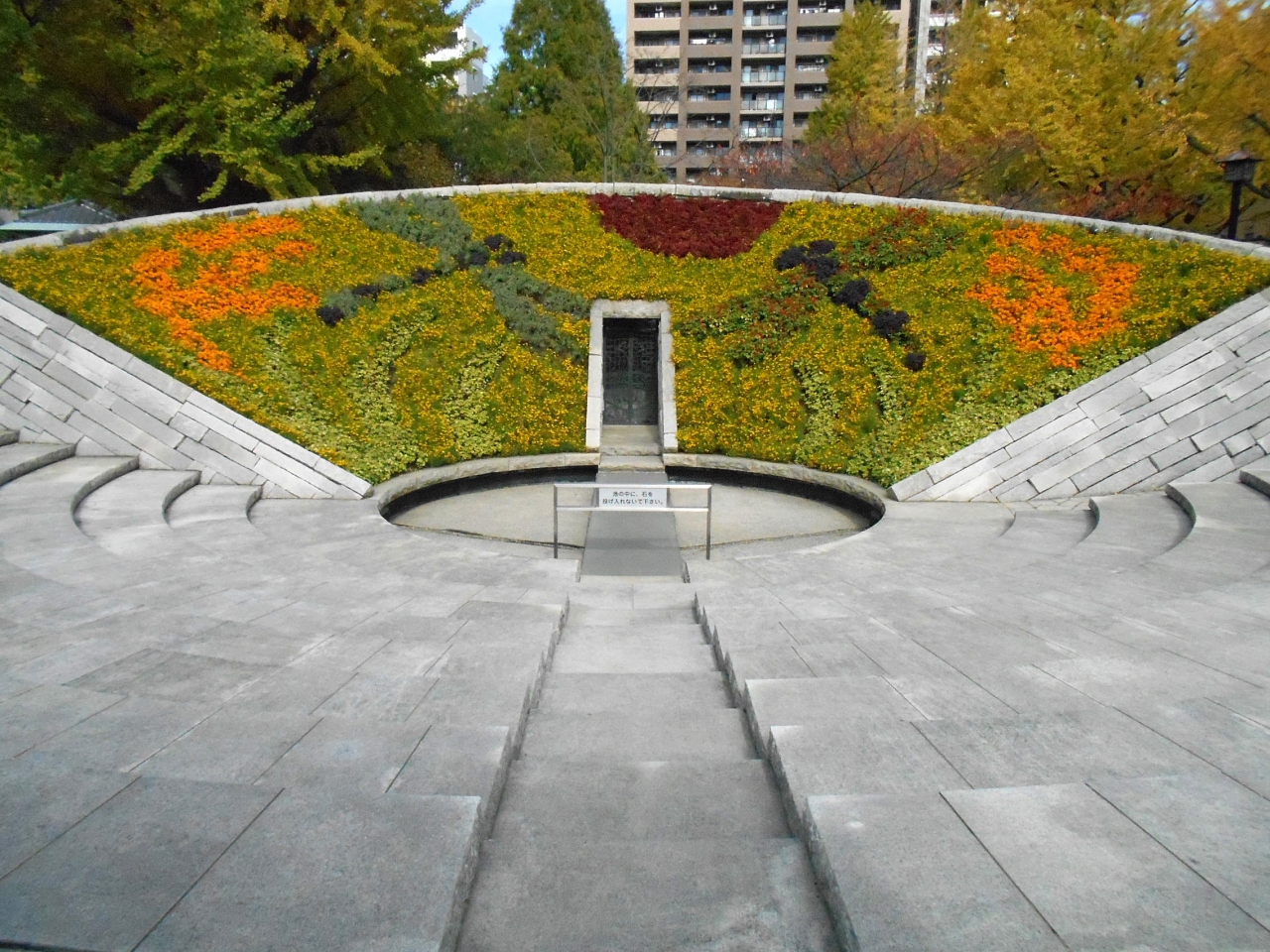 関東大震災の悲劇の場である「横網町公園」界隈は、東京大空襲においても再び焼け野原になり、多くの方の命を奪いました。この「東京空襲犠牲者を追悼し平和を祈念する碑」は斜面を季節の花々で覆われ、犠牲者のご冥福をお祈りしているようです。碑の中央部の扉の奥には、空襲で犠牲になった方々のお名前を記録した「東京空襲犠牲者名簿」が納められています。ただ…もはや記憶が薄れがちなのでしょう、慰霊に訪れる方の姿が少ないのが残念です。