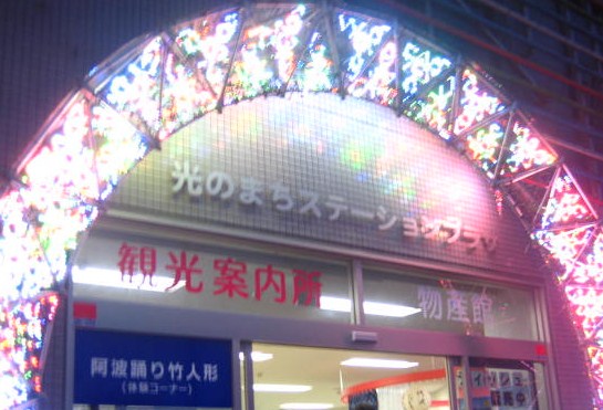 雨が降り出した中、阿南市のホテルに向かいましたが、その前に阿南駅の近くの光のまちステーションプラザに寄りました。LEDの生産は今や阿南市の産業として定着していますが、この施設は光のまち阿南を全国的にPRするため2006年オープンした建物だそうです。外観はLEDで装飾され、1階はLED商品等の展示販売、2階では照度を下げた薄暗がりの中、きらびやかなLED製品が展示されていてすごく綺麗です。万華鏡の世界のようで、明石海峡大橋のLED製品などに子供は興奮していました。