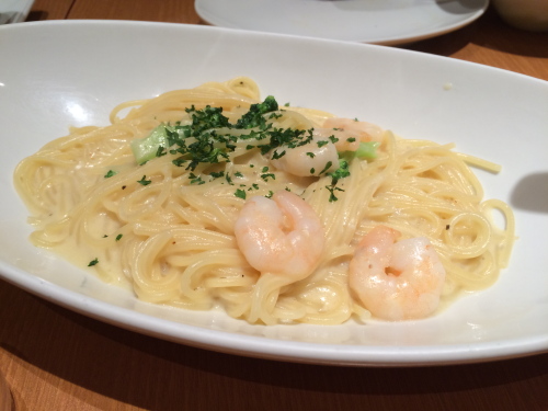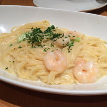 ブロッコリーとエビのクリームパスタはサラダセットで。
