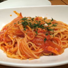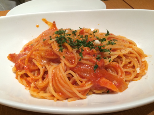ランチメニューからベーコンとトマトのパスタを3種類の前菜セットでオーダー。