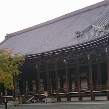 西本願寺の広い境内に佇む、大きな建物の左側が御影堂です。中央に親鸞聖人の木像、左右に本願寺歴代門主の御影が安置されています。前方には御影堂門、そして大銀杏の木があります。銀杏は色付き始めたばかりでした。