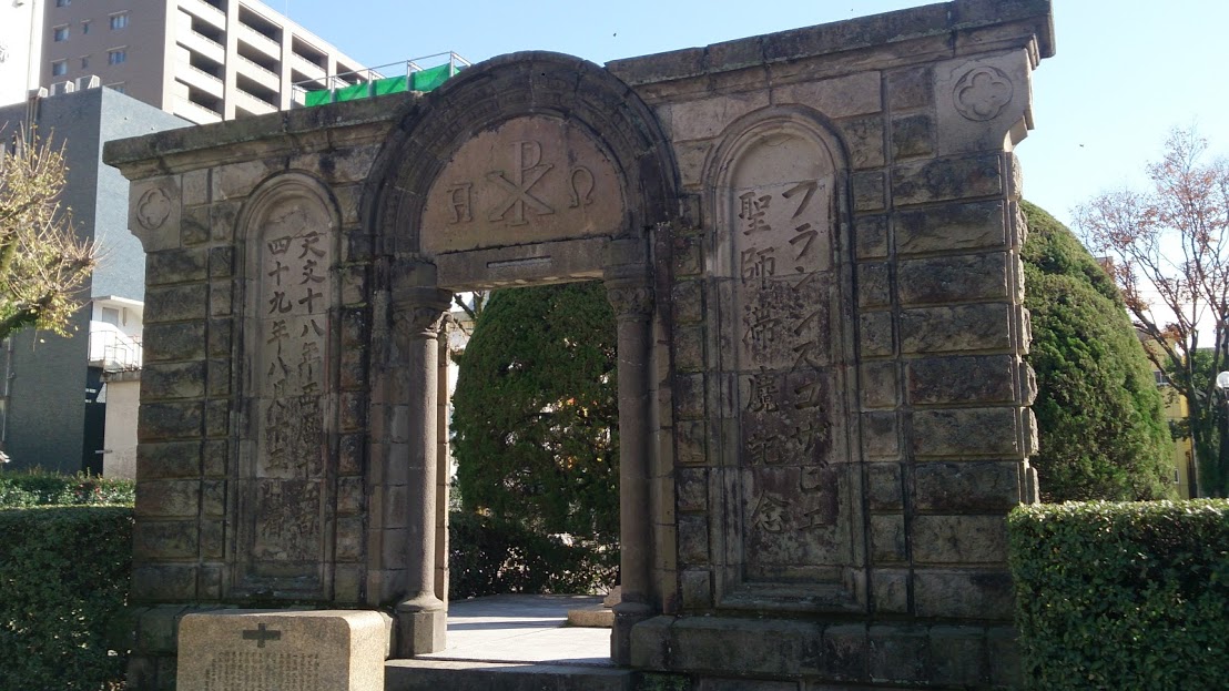 ザビエル公園の一画に建っていて、石造りで風雨にさらされていて、かなり劣化しているところが逆に良い風合いを出しています。そもそも明治時代に県内の初の石造り教会として建てられた教会跡で、先の大戦で大半が消失し、その残った壁面がこの記念碑になっているだけに、見た目もまさに教会のファサードそのものです。道路側から見るとこの記念碑のゲート部分の奥にフランシスコザビエルの胸像が見えるようになっており、工夫されていると思います。それ以外にも布教活動する姿のなのか?と思われる3体のブロンズ像が設置されるなど、ザビエル関連の史跡としてかなり力を入れた公園になっています。