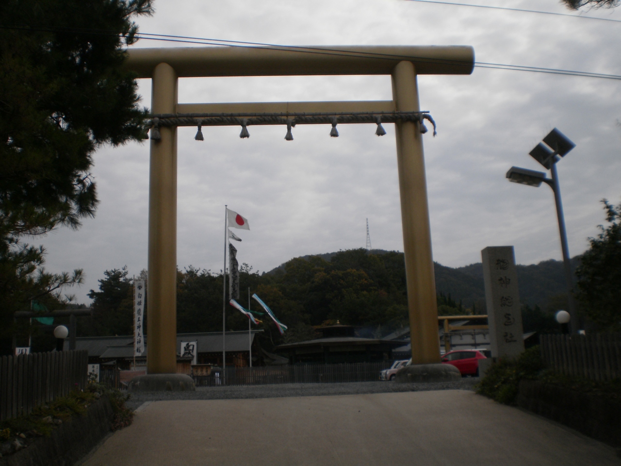観光用の地図に黄檗駅の萬福寺の近くに絵が載っていたので行ってみました。 でもけっこう遠くてのぼり坂の上です。 住宅街の向こうに金色の鳥居が見えたのでたどり着くことができました。 係員の人からパンフレットをいただいて、休憩所でお茶をいただきました。